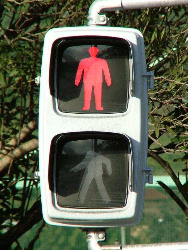 | こちらの信号は、撮影日が休日だからかどうかは不明ですが、閃光状態になっており、歩灯は滅灯していました。 主道側4基、従道側2基LED車灯があり(車灯すべて)、歩灯はランプ式でした。 敷地内に制御機があり、A形プログラム多段式交通信号制御機がありました。単独で動作するということのようです。 |
