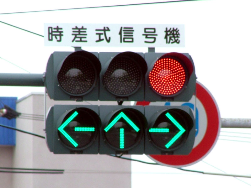 片方のみ、全方向に矢印を出し、実質、通常の時差動作と同じように進行できるタイプの灯器の組み合わせ。
