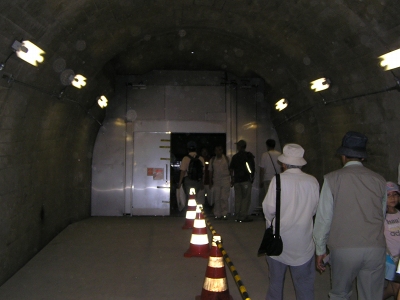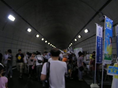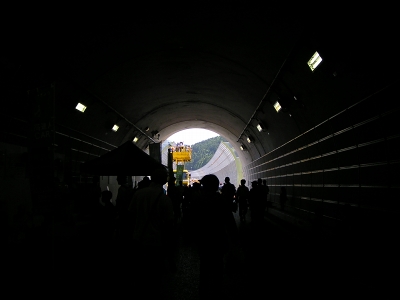 天合峰トンネルへ… いよいよ天合峰トンネルへと突入する。トンネル内も外に引けを取らず、出店やいろいろな展示ブースなどがあって非常ににぎわっていた。トンネル内部は非常に涼しかったので、むしろ個人的にはこちらを歩いている方が非常に楽であった(こんな猛暑にブレザーで来たのがアホだった)。 トンネルの入り口部分の標識では『天合峰トンネル』と書かれていたが、実際には『宝生寺(ほうしょうじ)トンネルと言うそうな。いわゆる高速道路の路線名称と愛称の違いと同じような考え方なのだろうか。 余談だが、トンネルの内部で昼食を採っている光景というのはなんとも不思議なものだった。 |