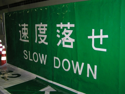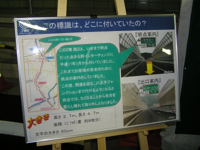 | 意外な『物』との再会?? さてさて、トンネルをどんどん突き進んでいくと意外な物と遭遇した。 一見するとイベント用に用意された標識を模したビニールのシートに見えるが、実は本当に現場で使用されていた『標識』そのものなのである。ではどこで使用されていたのかというと、まず上部写真の左最下部を見ていただきたい。標識部の番号が『42』と表記されているのがおわかりいただけるだろうか。これはかつてあきる野ICにあったもので、2005年3月から現在まで実際に標識として活躍していたのである。今回、八王子JCTまで延伸開通することから役目を終え、現在は通常の標識に戻されている。 いやはや標識がまさかこのようなビニールのシートで構成されていたとは非常に驚きである。 |