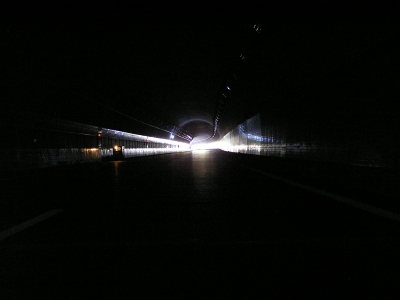 非常用通路 トンネルでは内部での災害に備えて、非常用の通路が用意されており、これを通ることで外回り側のトンネルと内回り側のトンネル間を相互に出入りすることが出来る。 内部は通常のトンネルを低くしたような感じで、決して広いとは言えない。通路内には大きな鉄製の扉があり、これで相互のトンネルを仕切っているようである。 通路を渡って反対側のトンネルに出てみると、圏央道開通へ向けての紹介ビデオが上映されていた。トンネルを一本まるまる使用してビデオの上映会を行うとは何とも贅沢である。 この通路も普段通行することなどまずあり得ないので、非常に貴重な体験といえよう。 |