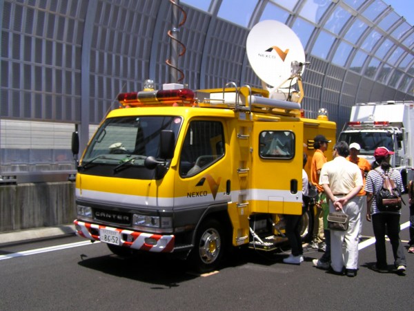![]() ▲展示車両 A − 衛星通信車 地震や台風の時に現地の映像を衛星を経由して送信する。 |