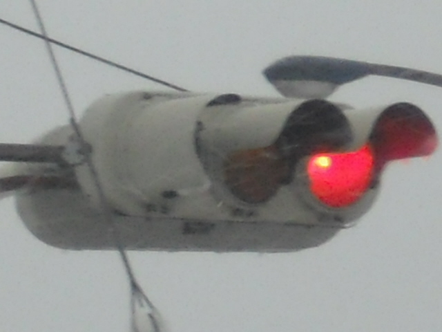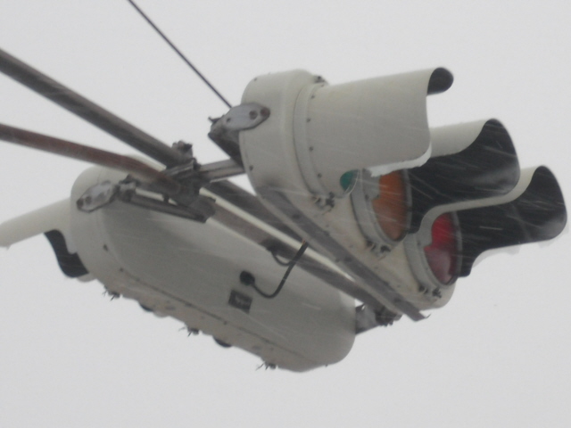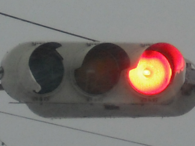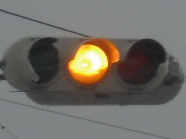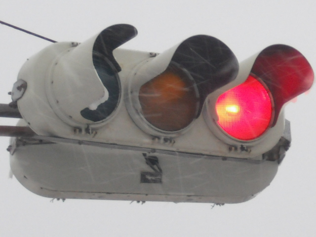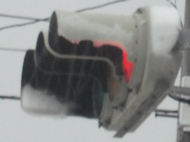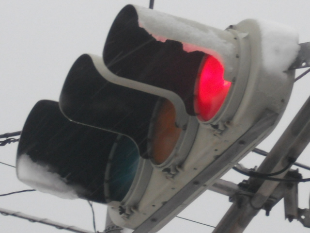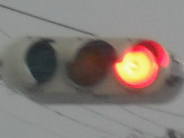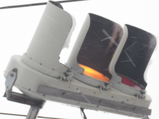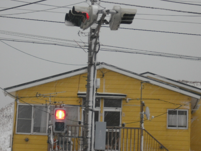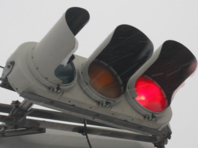日本信号製 | 赤だけ筒型庇です。 地下鉄宮の沢駅からすぐの場所です。この信号機は常時赤点滅なので、住宅に配慮して、点灯する、赤だけ、筒庇にしたのでは、ないでしょうか。 |