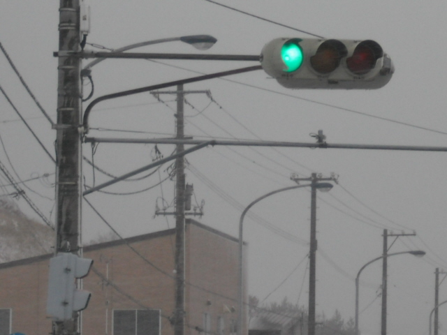 | 豊浦町の国道37号にも青だけ横向き庇の横樹脂がありました。しかし、この交差点は普通の押しボタン式の交差点でなぜ認知防止をしているのか謎です‥。