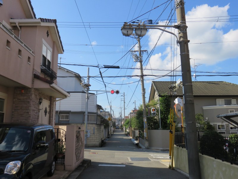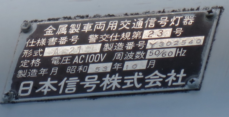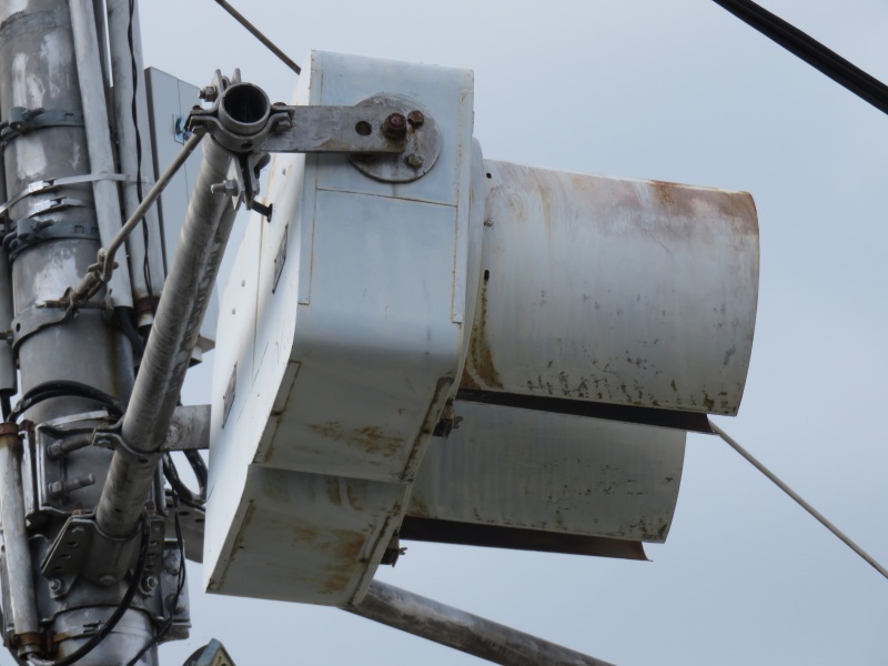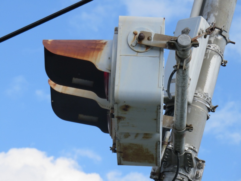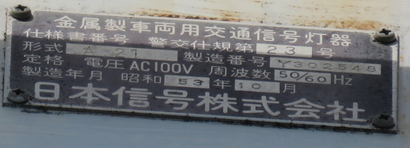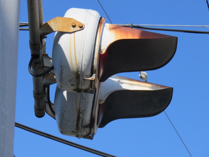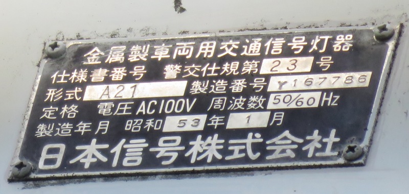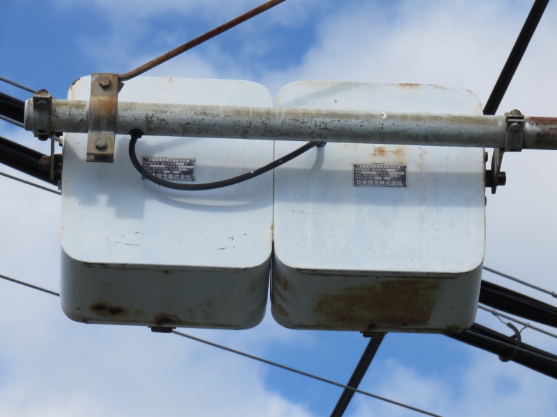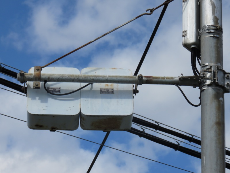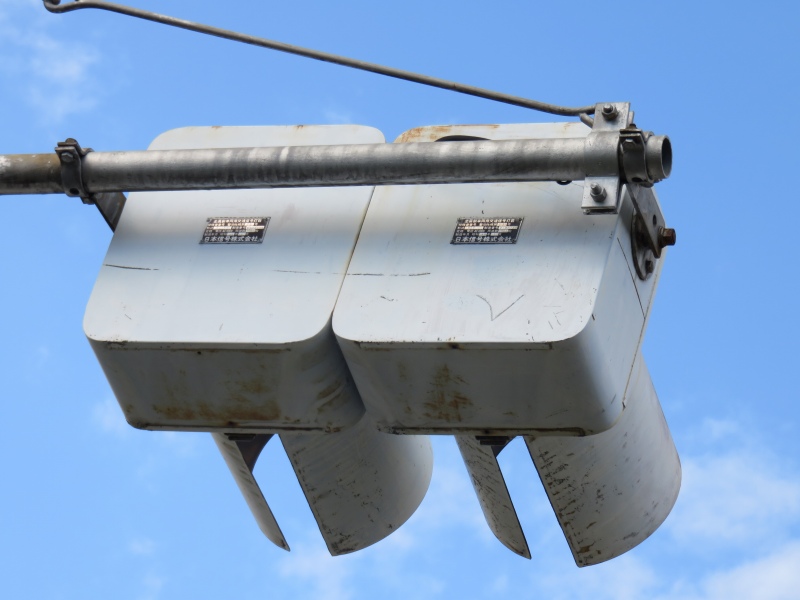 兵庫県内では交通量の少ない道路向けに赤赤灯器が設置されていますが、古い世代の灯器もいくつか残っています。この交差点にはNS3代目250の赤赤灯器が2基(2セット)あります。赤1灯を2基繋げて赤赤の2灯にしているようです。そもそもNSの3代目の1灯自体なかなか見られなくなりつつあるので大変貴重ですね。1基は認知防止庇となっています。他で見る赤赤と同じように 進行させるときが左赤点滅、通常は右の赤が点灯します。昭和53年製です。