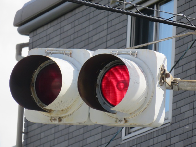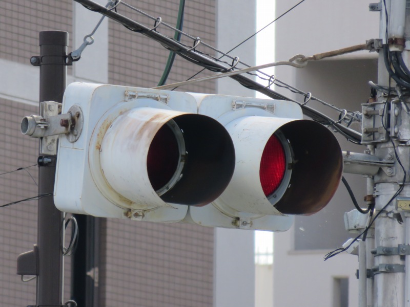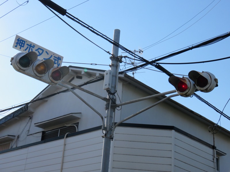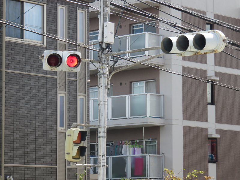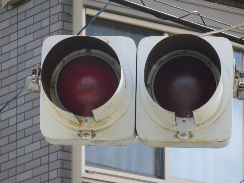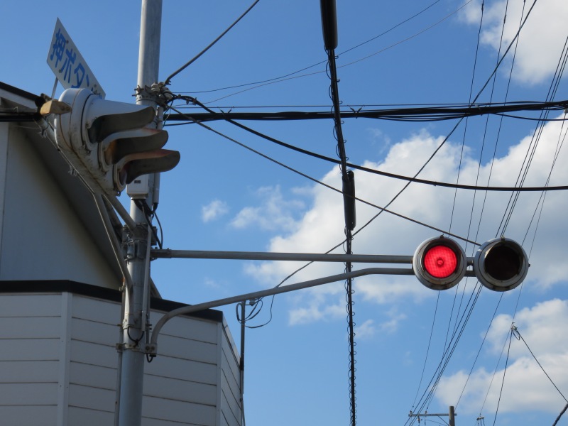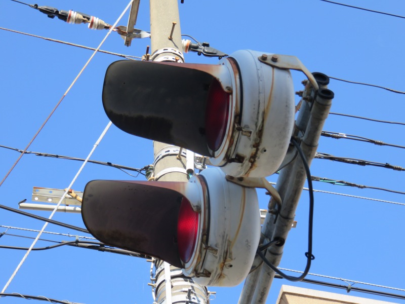 こちらは宇宙人1灯の赤赤灯器です。こちらも1灯が2つ並べられて赤赤となっています。押しボタン式交差点に向かい合わせで2基設置されています。やはり宇宙人1灯自体全国的にもなかなか見られなくなりつつあるので非常に貴重ですね。形が完全な円形で面白いです。銘板はありませんが、同じ交差点の宇宙人が昭和54年製で、この宇宙人赤赤も直線アームであることから、おそらく同世代の新しいものだと思われます。