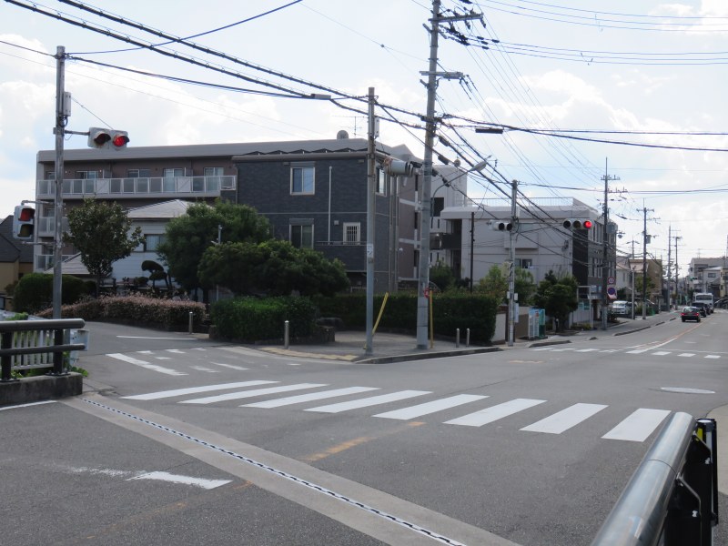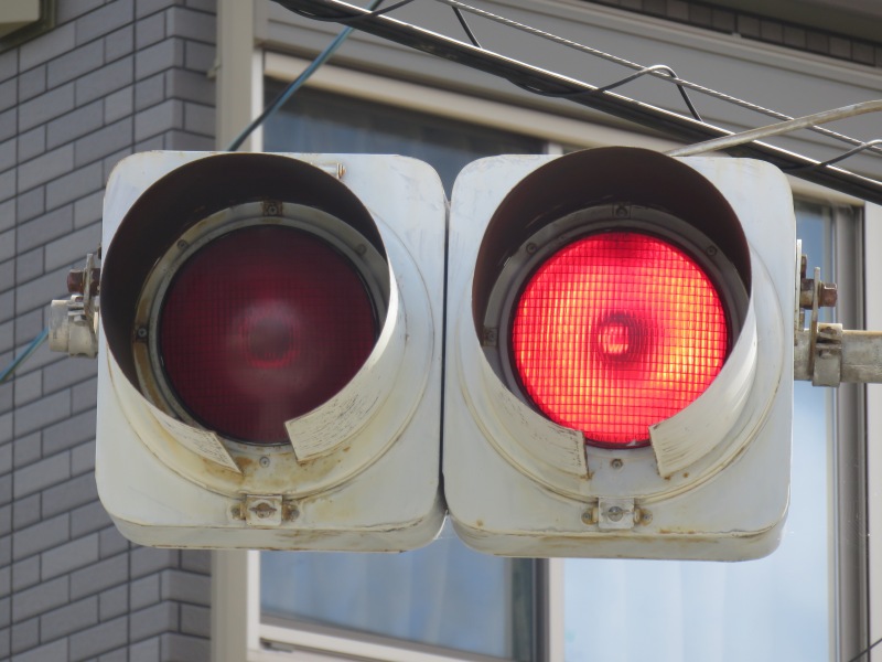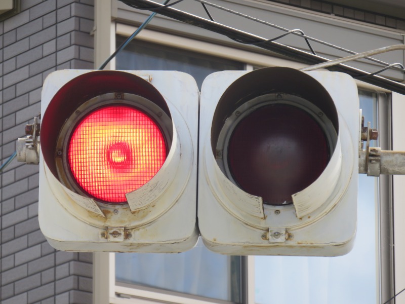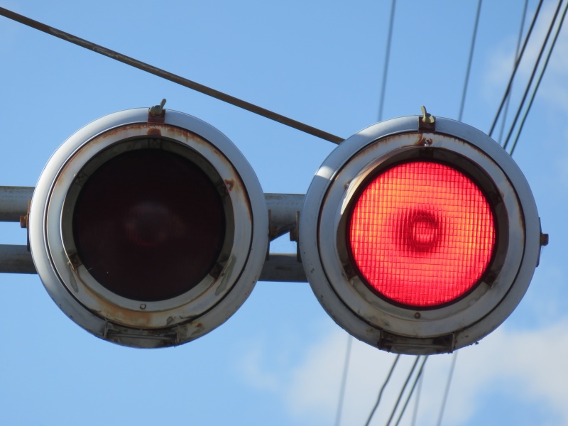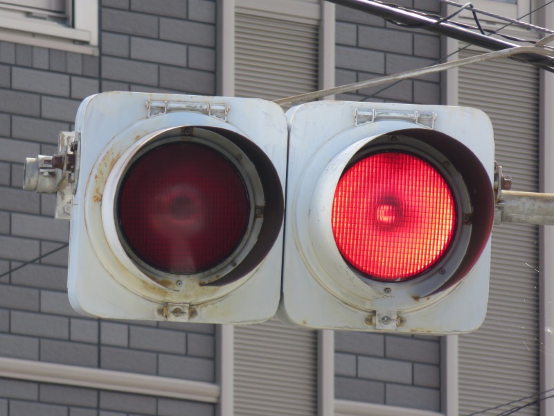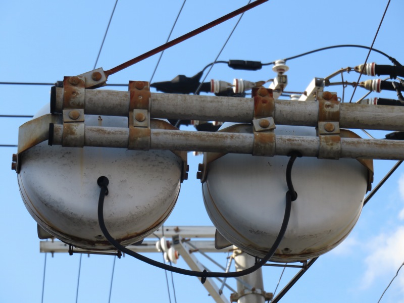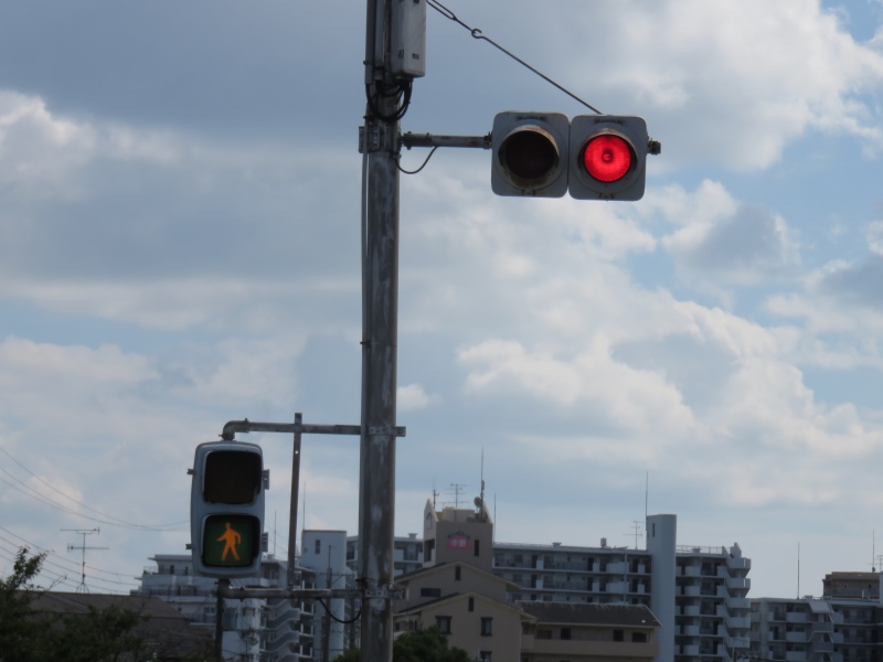 こちらは宇宙人1灯の赤赤灯器です。こちらも1灯が2つ並べられて赤赤となっています。押しボタン式交差点に向かい合わせで2基設置されています。やはり宇宙人1灯自体全国的にもなかなか見られなくなりつつあるので非常に貴重ですね。形が完全な円形で面白いです。銘板はありませんが、同じ交差点の宇宙人が昭和54年製で、この宇宙人赤赤も直線アームであることから、おそらく同世代の新しいものだと思われます。