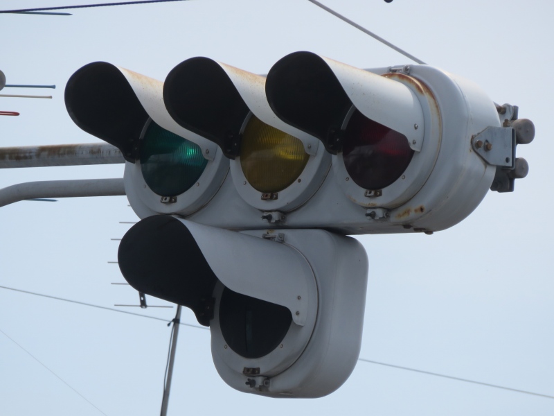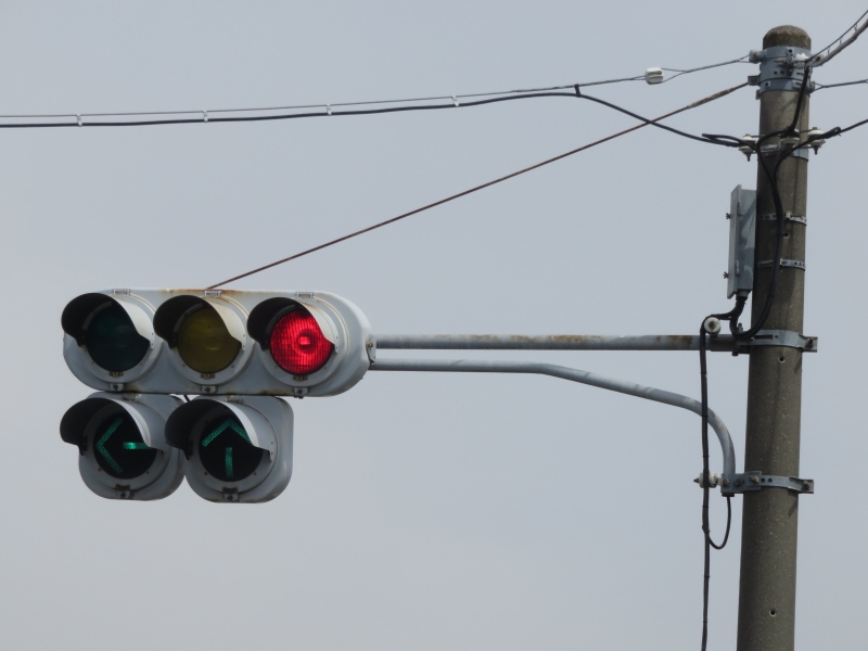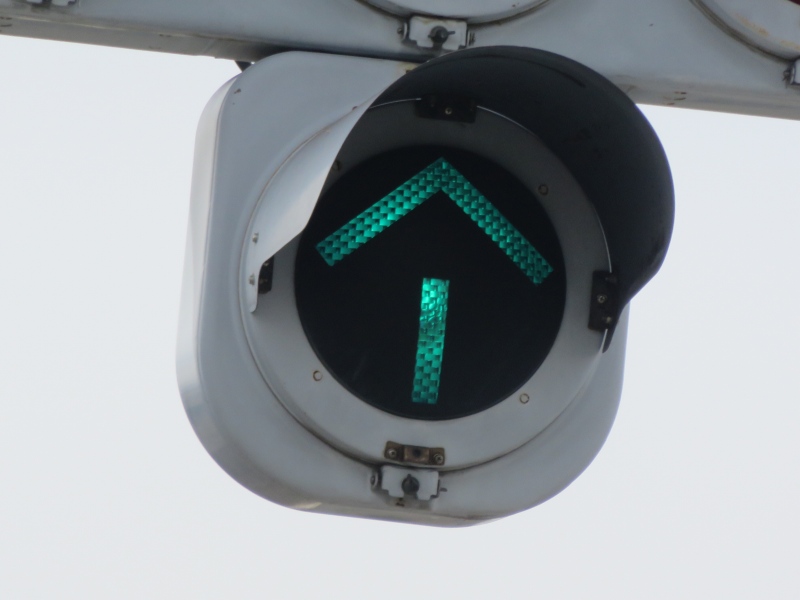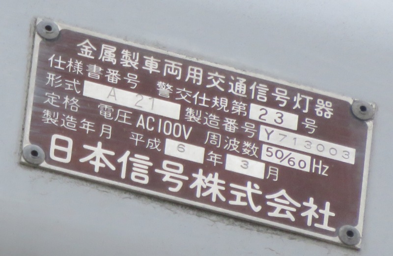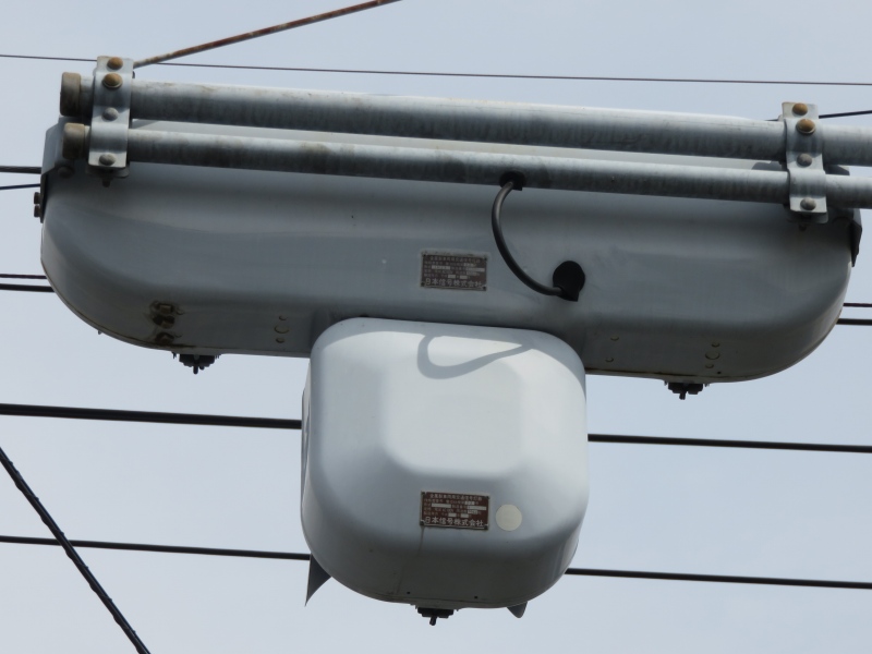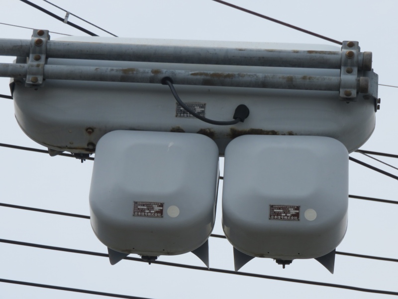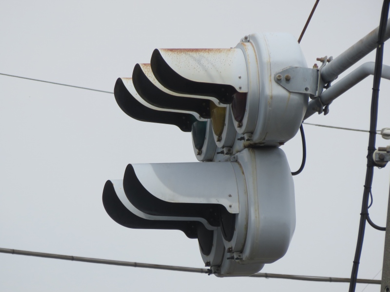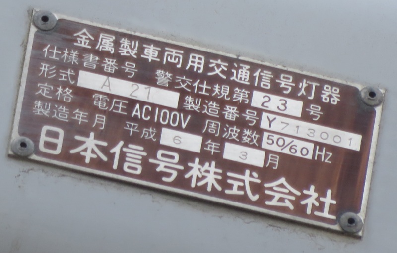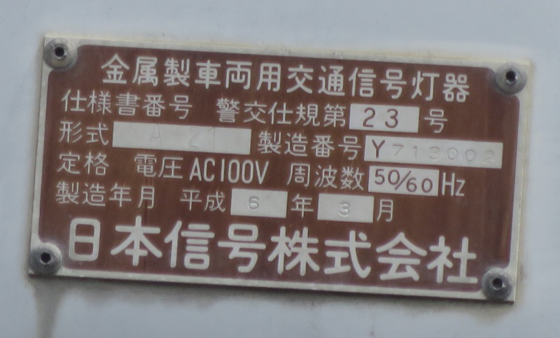 この交差点は水海道駅付近の踏切に隣接する交差点に設置されていて、普段は矢印は点灯しませんが、踏切の遮断機が降りると、片方は直進矢印、もう片方は直進・左折矢印が点灯し、踏切に車が進行しないように制御されています。矢印はNS銘板で平成6年製と比較的新しいもので、外庇のものとなっています。