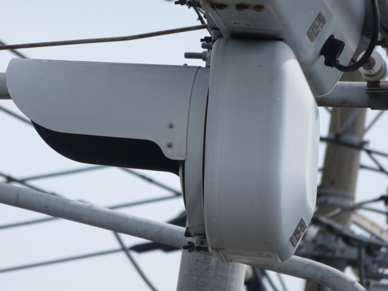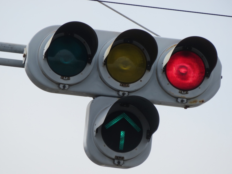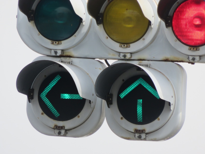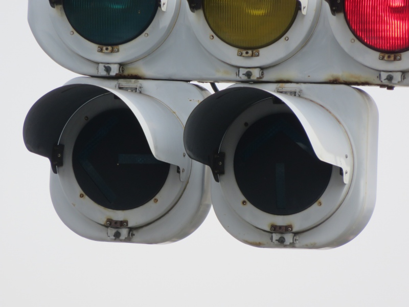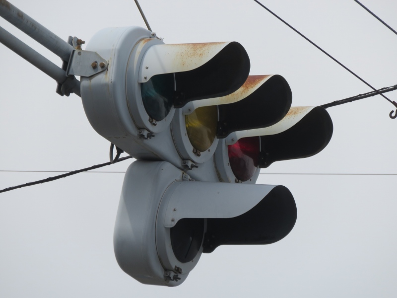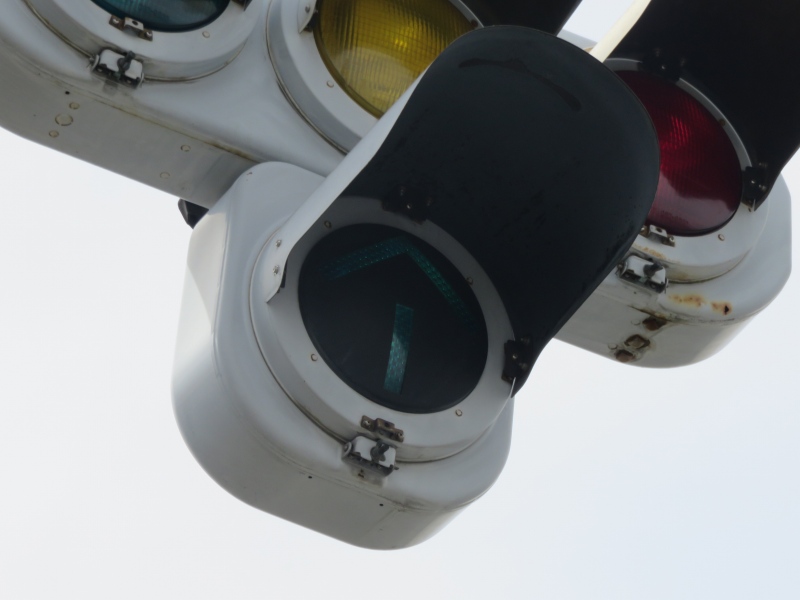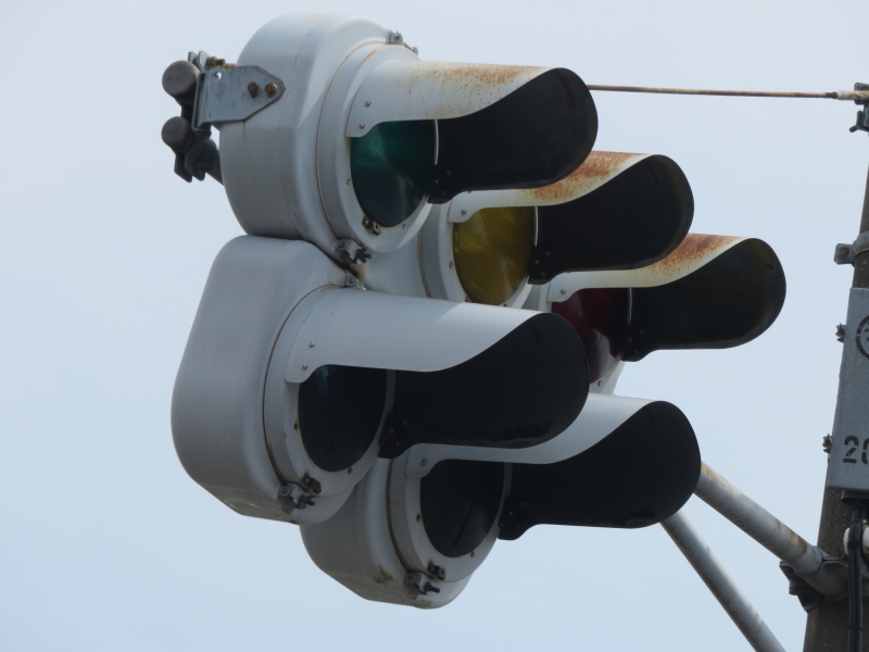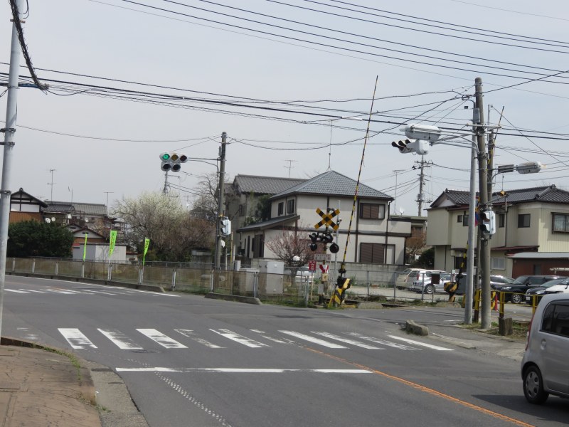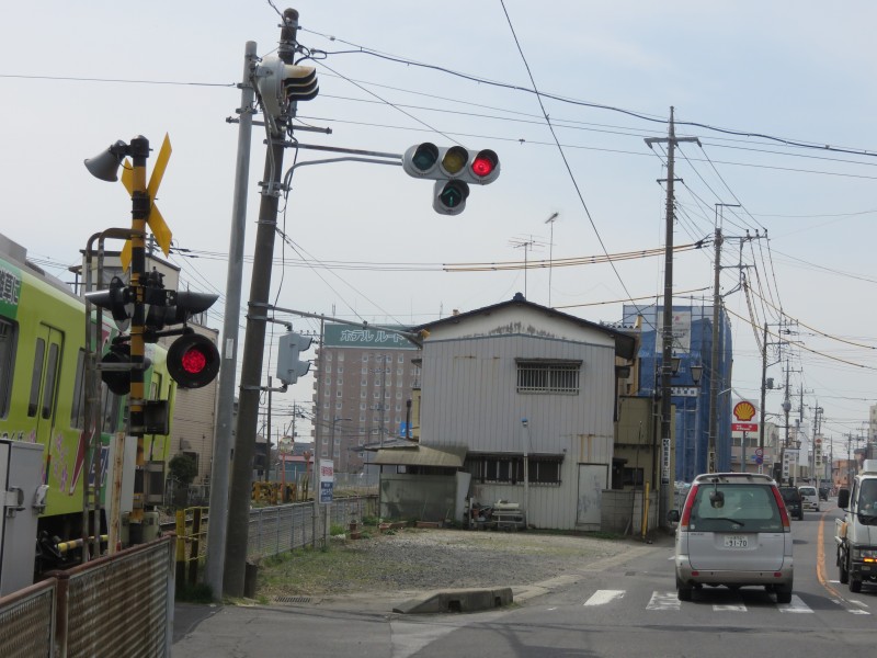 この交差点は水海道駅付近の踏切に隣接する交差点に設置されていて、普段は矢印は点灯しませんが、踏切の遮断機が降りると、片方は直進矢印、もう片方は直進・左折矢印が点灯し、踏切に車が進行しないように制御されています。矢印はNS銘板で平成6年製と比較的新しいもので、外庇のものとなっています。