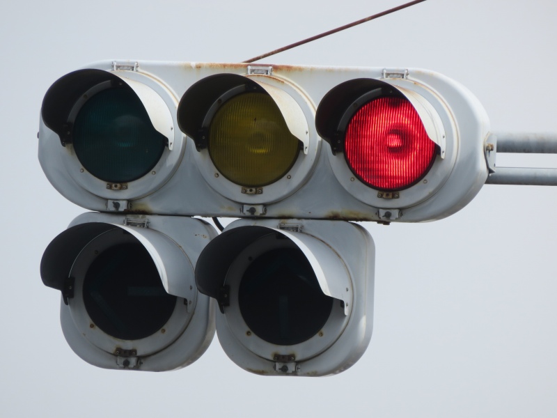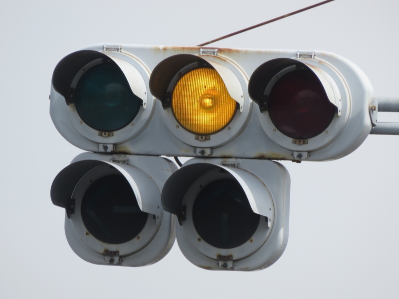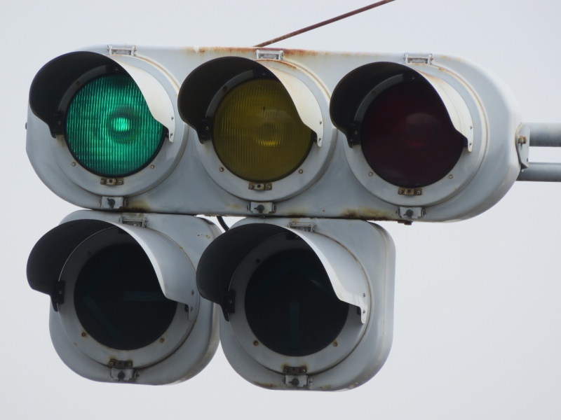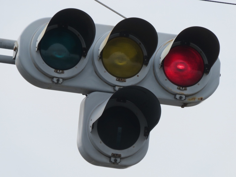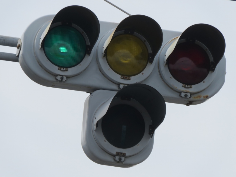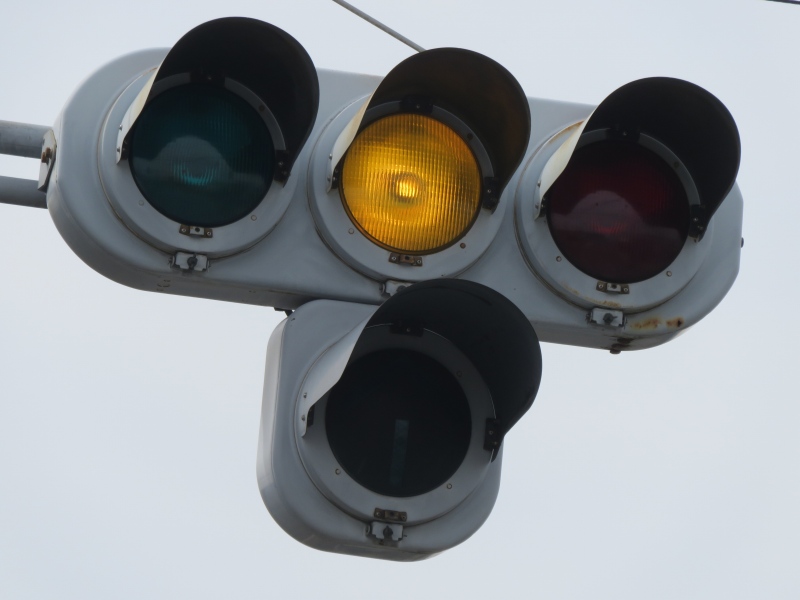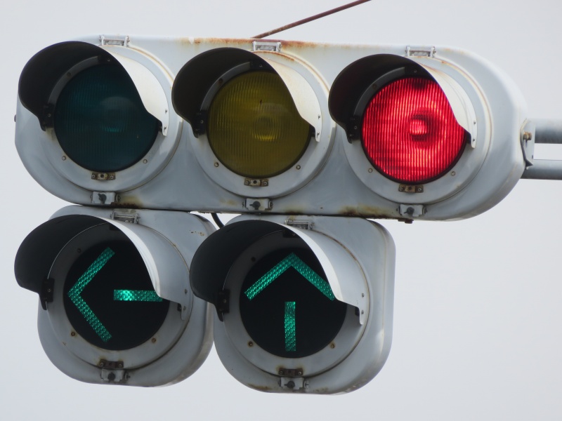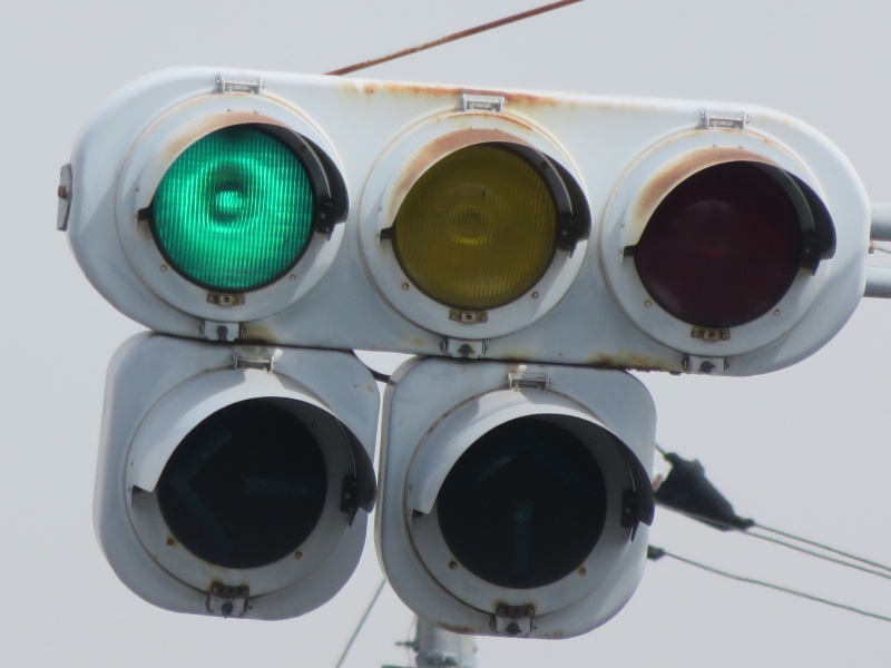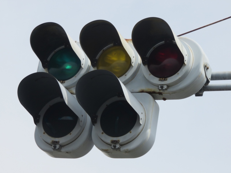 この交差点は水海道駅付近の踏切に隣接する交差点に設置されていて、普段は矢印は点灯しませんが、踏切の遮断機が降りると、片方は直進矢印、もう片方は直進・左折矢印が点灯し、踏切に車が進行しないように制御されています。矢印はNS銘板で平成6年製と比較的新しいもので、外庇のものとなっています。