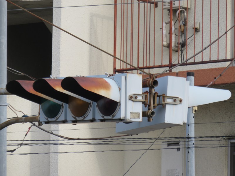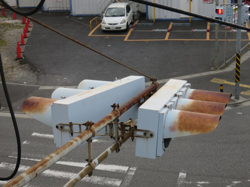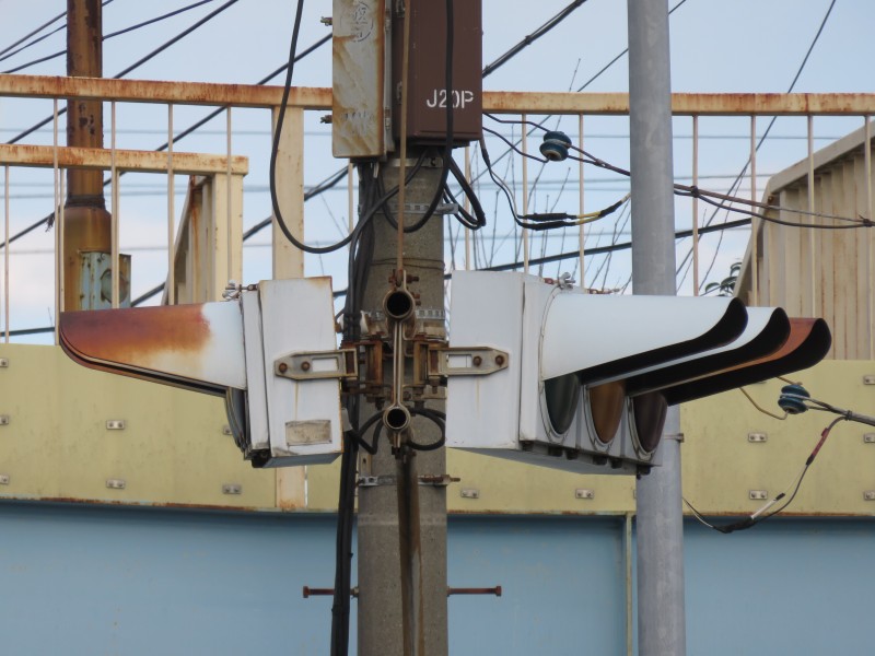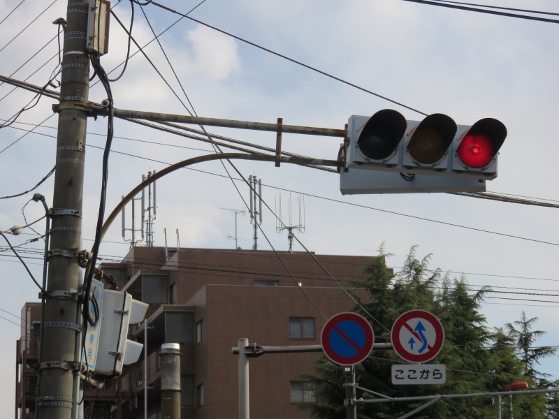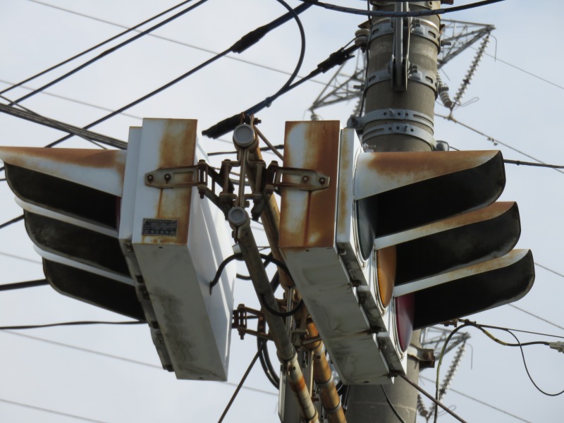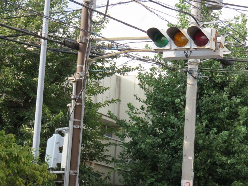 (情報提供感謝:森リンさん) こちらも横浜市内の住宅街に残る2基セットですが、なぜか直線アームに設置されており、また狭い路地の押しボタンなので節約設置で1セットしか設置されていません。なかなか面白い設置ですね。