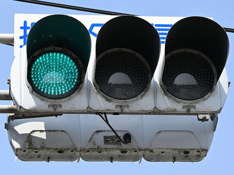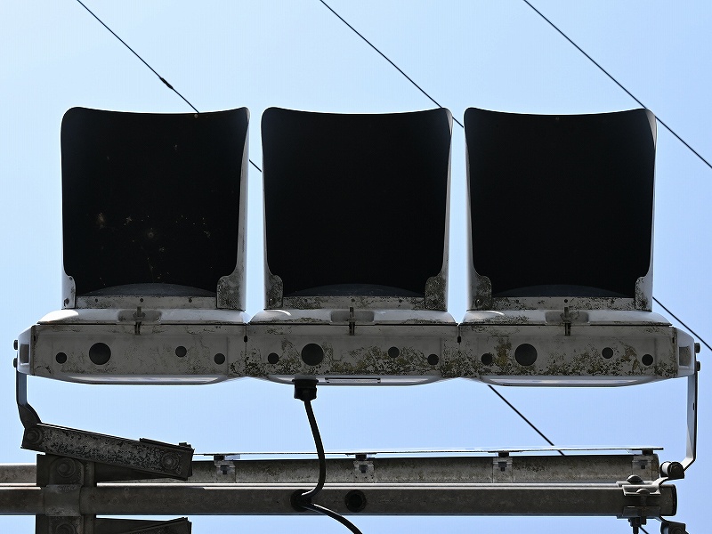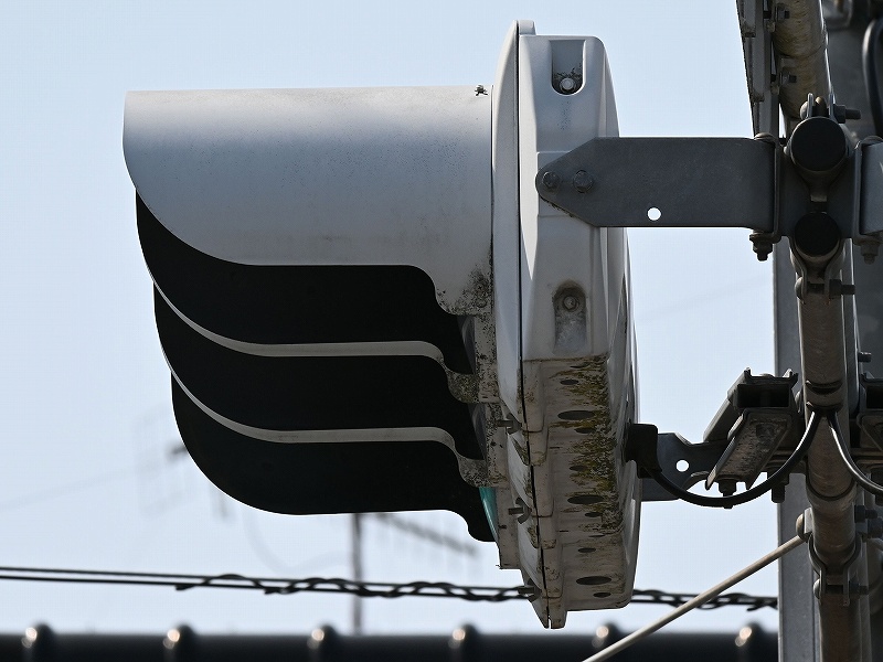 | 金沢市内の押しボタン式の交差点にある小糸製の薄型LEDですが、押しボタンで青の点灯時間が長く不具合あるいは劣化が起きたためか青素子だけ換装されています。最近は薄型LEDでも初期の薄型LEDであれば年数が経過しているため、換装されている交差点もちらほら見られますが、この交差点の灯器はなんと東京都内の警管仕の薄型LEDでよく使用されている250mmの薄型LEDの素子がなぜか使用されています!これは東京都内以外ではそもそもほとんど見られないため、なぜ換装で持ってこれたのか気になるところです。灯器は2010年製の小糸製の薄型で背面にプレスがH型に入っている第一世代の薄型LEDです。なおこの交差点の比較的近くの東金沢駅近くの自転車2灯では電材の薄型LEDの250mm素子(こちらも主に警管仕の灯器で使われているもの)もあったりと極稀に警管仕で使われる250mm素子を見ることができます。この交差点の4基の小糸薄型のうち主信号の2基の青素子が250mmLEDとなっています。残る補助信号の2基もかなり青素子が劣化しており相当光り方にムラがあり、そのうちこの2基も青素子が換装されるかもしれませんね。 |