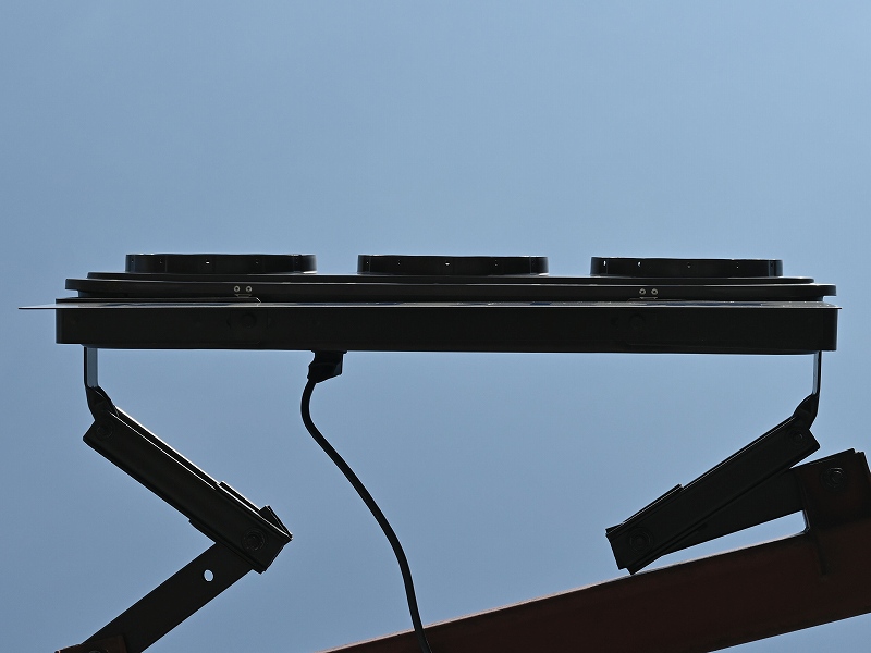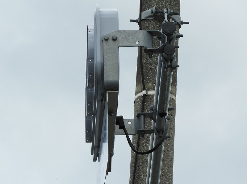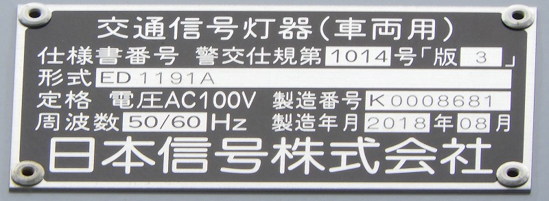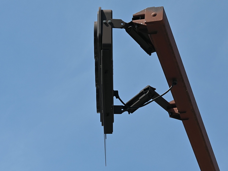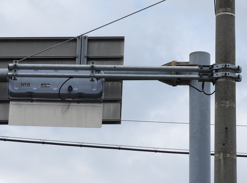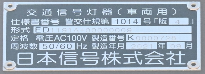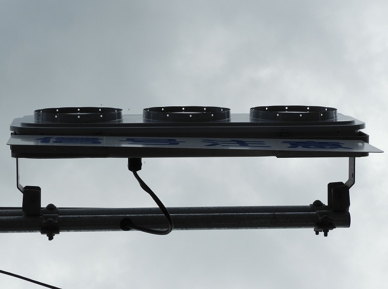 | 2025年8月13日撮影 熊本市街地の路面電車沿いの交差点の従道側にある予告信号です。交差点の直前に設置されており、以前は黄黄黄ではなく、通常の3灯だったようです。こちらも日信低コストの黄黄黄です。熊本県内では電材筐体の低コストの黄黄黄が増えているようですので、日信低コストの黄黄黄の数はあまり多くないかもしれません。こちらは茶塗装となっています。2021年製。 |
