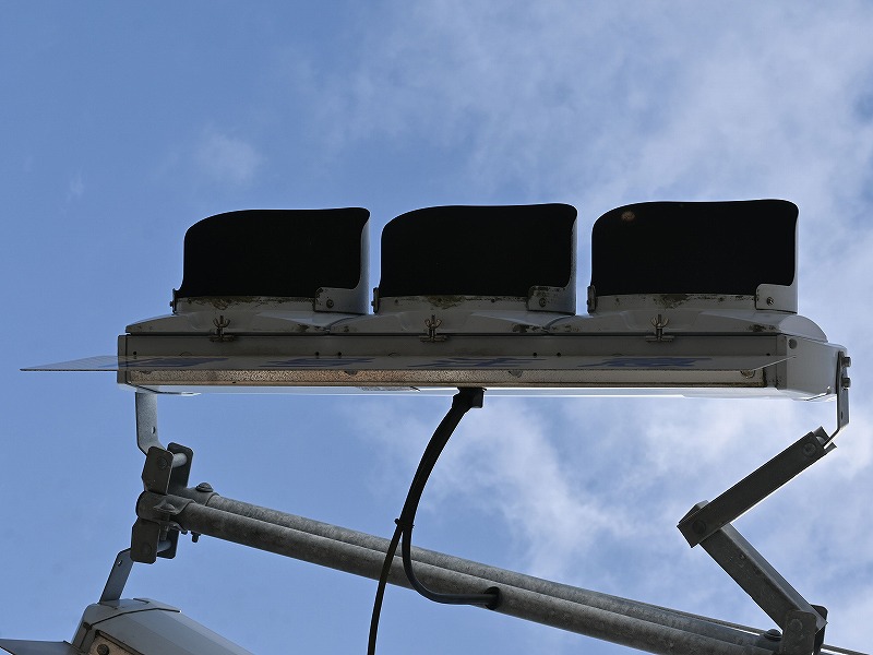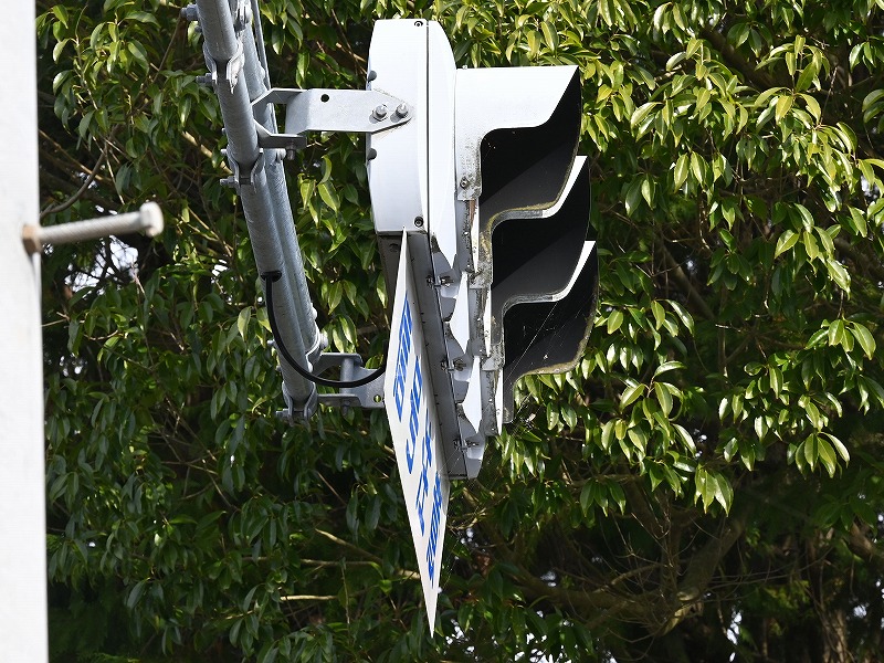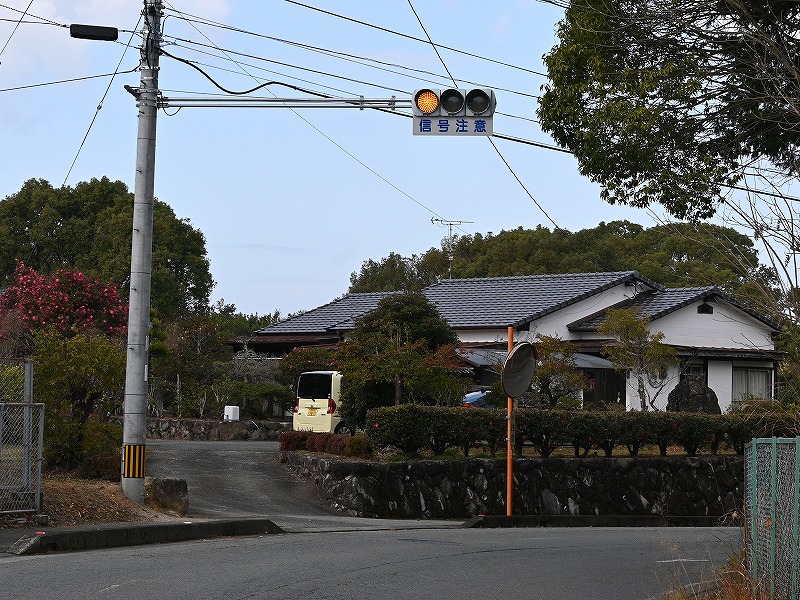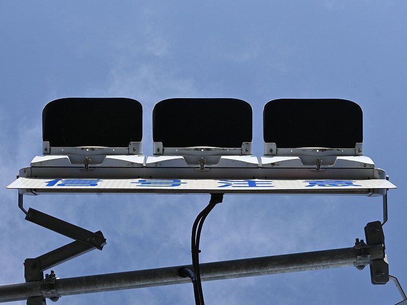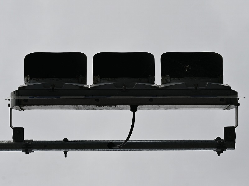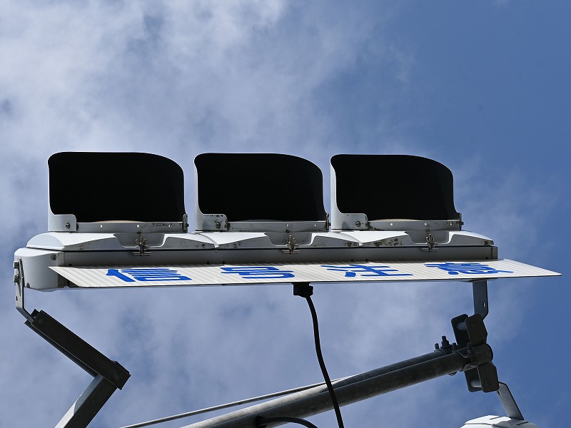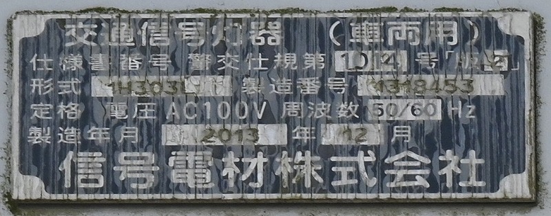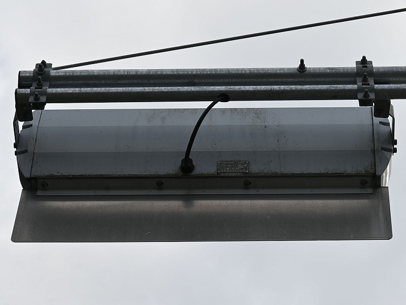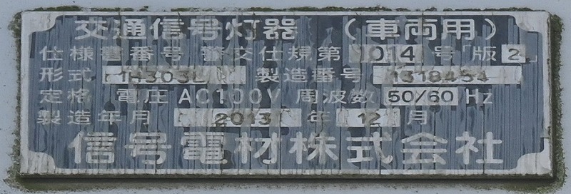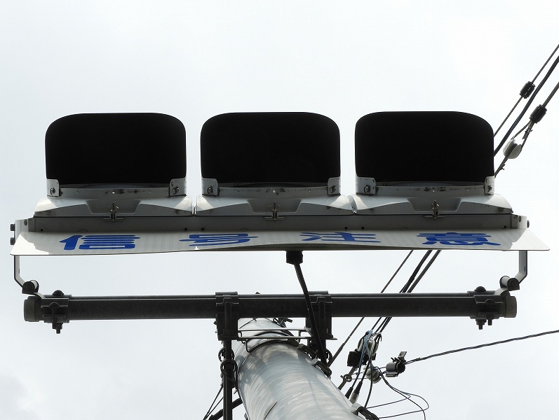 | 荒尾市郊外の小学校付近にある押しボタン式信号機の予告信号として設置されている電材薄型の黄黄黄です。こちらは面拡散タイプの薄型LEDとなっていて、使用していない真ん中の黄の位置も蓋ではなく通常通り素子が入っているようです。2012年製です。 | |