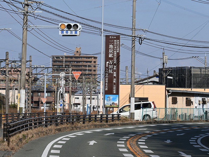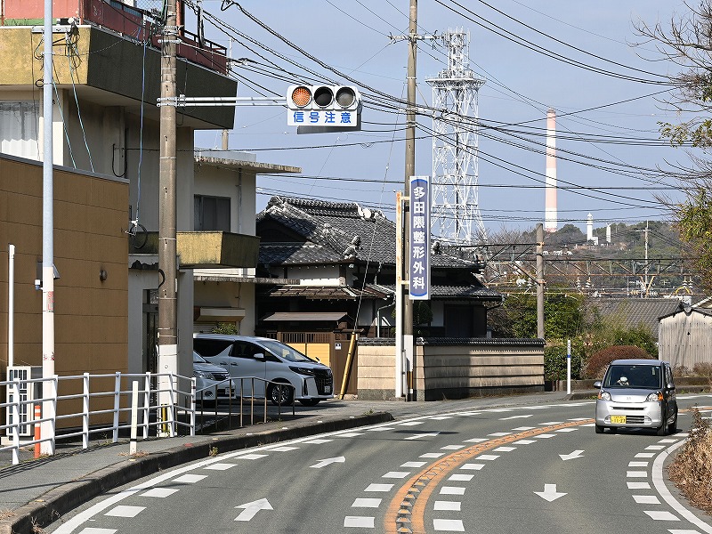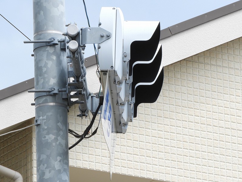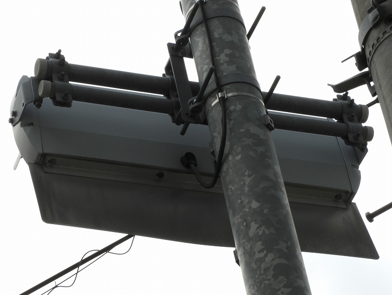 | JR荒尾駅近く、国道208号沿いの2つの交差点の予告信号として設置されている信号電材薄型LEDです。ここは少し面白くて、押しボタン式交差点と通常の信号交差点との間にカーブがあり、その2つの交差点同士は350m程度離れているのですが、そのカーブのところ2箇所に両面設置で予告信号が設置されており、計4基黄黄黄が設置されています。2番と違い使用する真ん中の黄の位置は蓋となっていて、素子は入っておりません。2013年製。 |