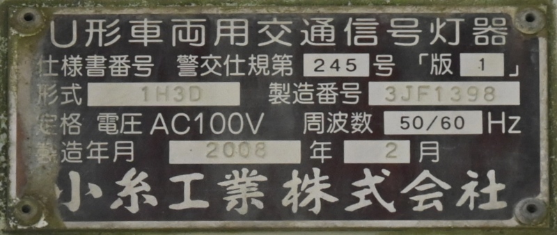 | 2025年8月13日撮影 こちらも小糸アルミベースで深い庇タイプの黄黄黄です。2008年(平成20年)製と結構新しい製造となっていて、U型銘板となっています。 | |