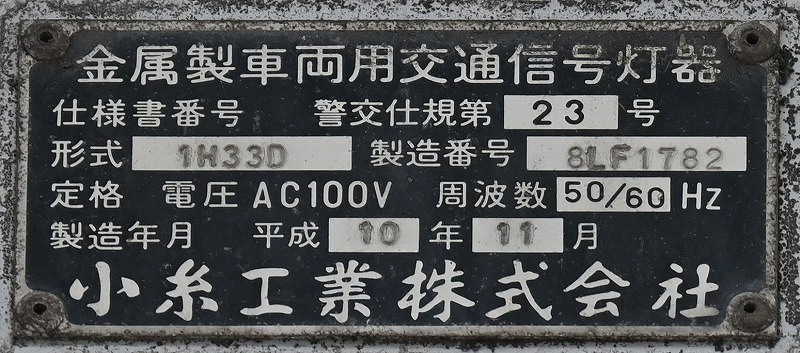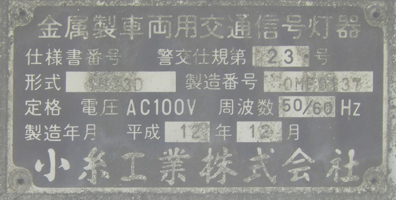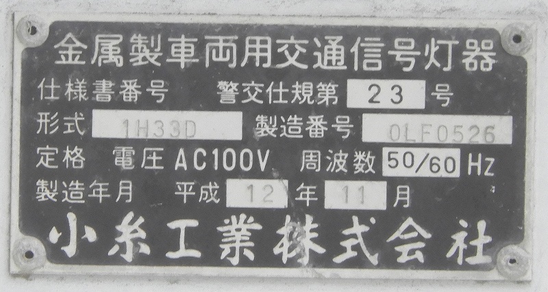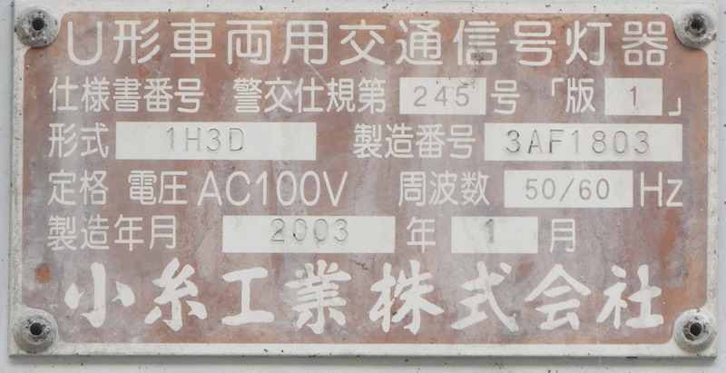 | (情報提供・撮影協力:みつごんさん) こちらも小糸アルミベースの黄黄黄です。2003年(平成15年)製です。U形銘板となっています。 |