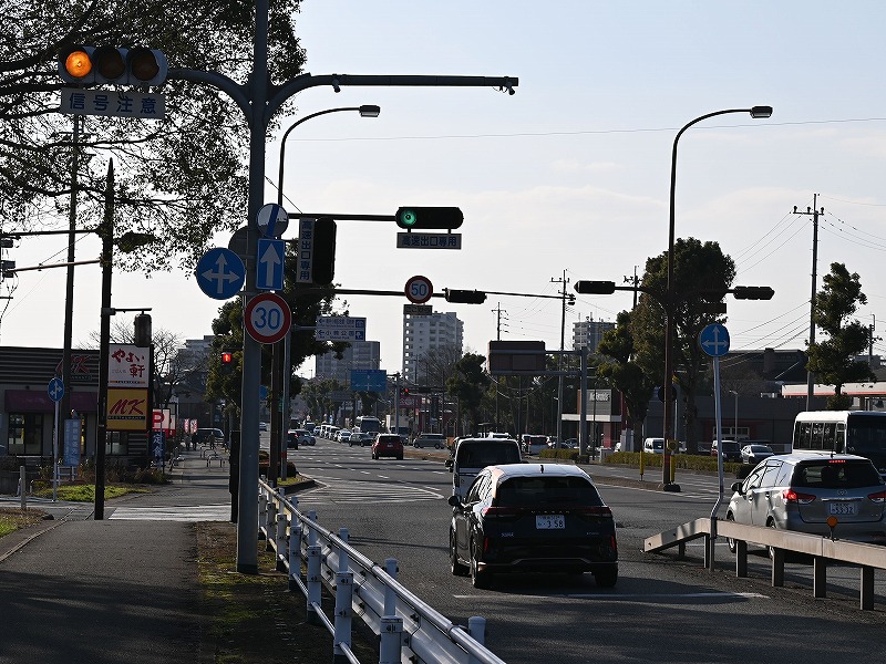 | 熊本県内では標準で予告信号として黄黄黄が採用されています。さまざまなタイプの灯器がありますが、その中でも比較的よく見かけるのが小糸アルミ灯器ベースの黄黄黄です。まず紹介するのは熊本市街地の高速で来たときの玄関口の一つ、益城熊本空港インター付近にある小糸アルミD型浅庇の黄黄黄です。県内他の箇所でも見ることができますが、知名度が場所柄比較的高い気がします。平成10年製。 | |
