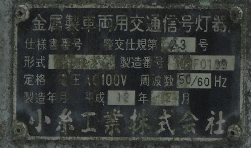 | (情報提供・撮影協力:みつごんさん) こちらは小糸アルミベースで深い庇タイプの黄黄黄です。平成12年製です。金属製〜銘板となっています。 | |
