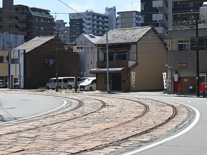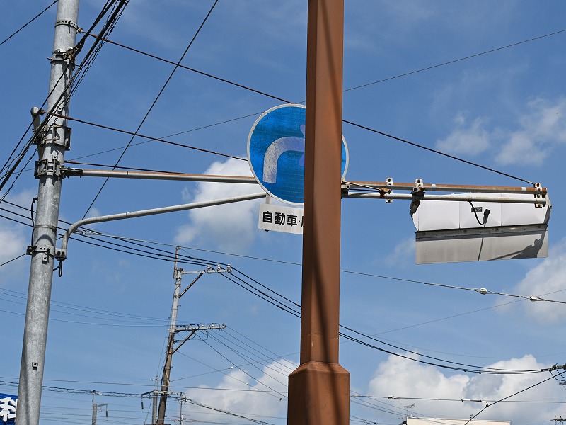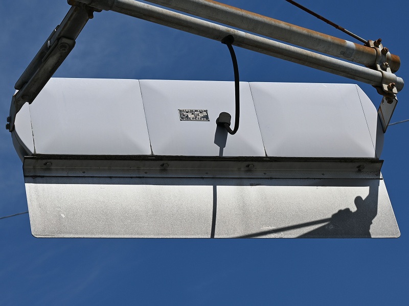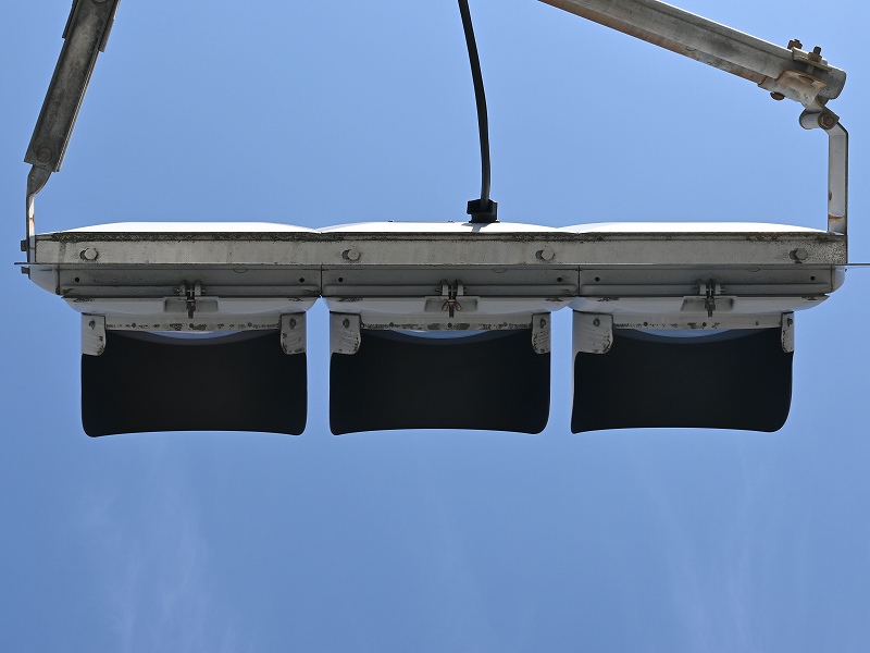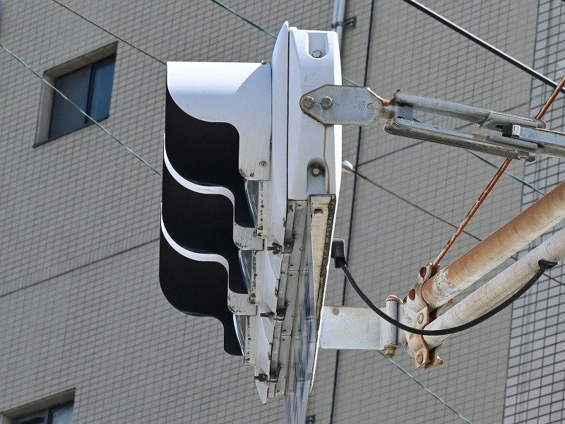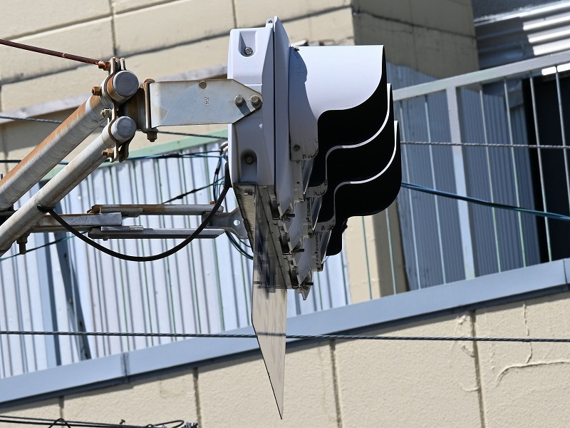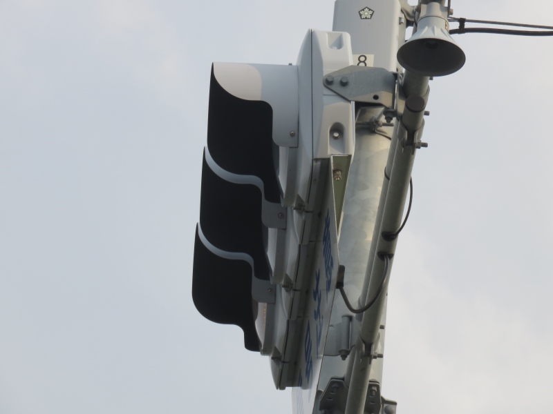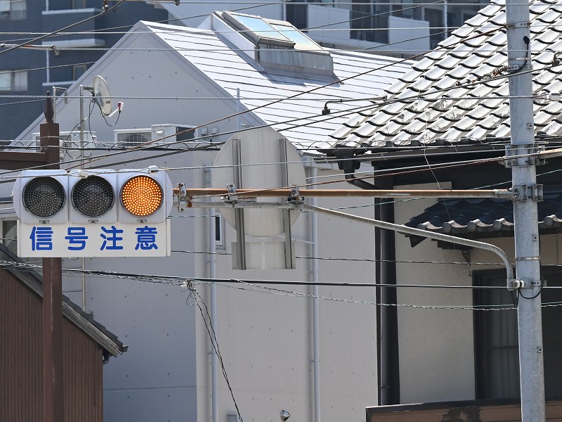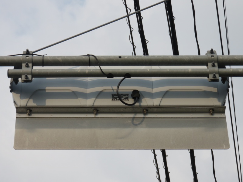 | 2025年8月13日撮影 熊本市街地の路面電車沿いにある押しボタン式交差点の予告信号として設置されているコイト電工製の薄型LEDの黄黄黄です。こちらは1番のより後の世代のもので、TK2世代ですが、背面のH型のプレスがない2世代目の薄型LEDです。形式は1H3GYRTK2となっており、黄黄黄ではなく、当初は青黄赤の通常の3灯として製造されたようです。2012年製。アームは電球式時代の古いものを流用したようです。 |