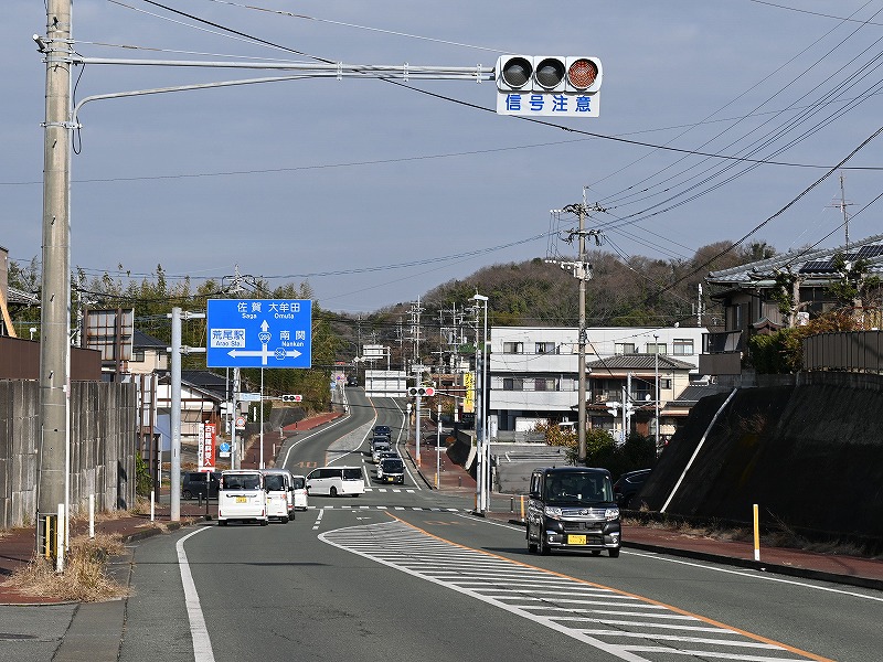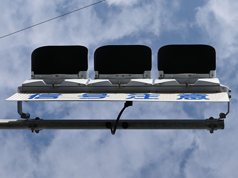| (情報提供・撮影協力:みつごんさん) 熊本県で標準設置されている予告信号の黄黄黄(または黄・不明・黄)です。熊本県内は星和・三協の設置が他県より多く見られ、数は僅かながら星和銘板の薄型LEDの黄黄黄もいくつか設置されています。星和オリジナル筐体の黄黄黄は確認されておりませんが、星和銘板の電材薄型のものがいくつかあります。この交差点のものは使用していない真ん中の黄の位置にLED素子が入っていないタイプです。2010年製です。 | |