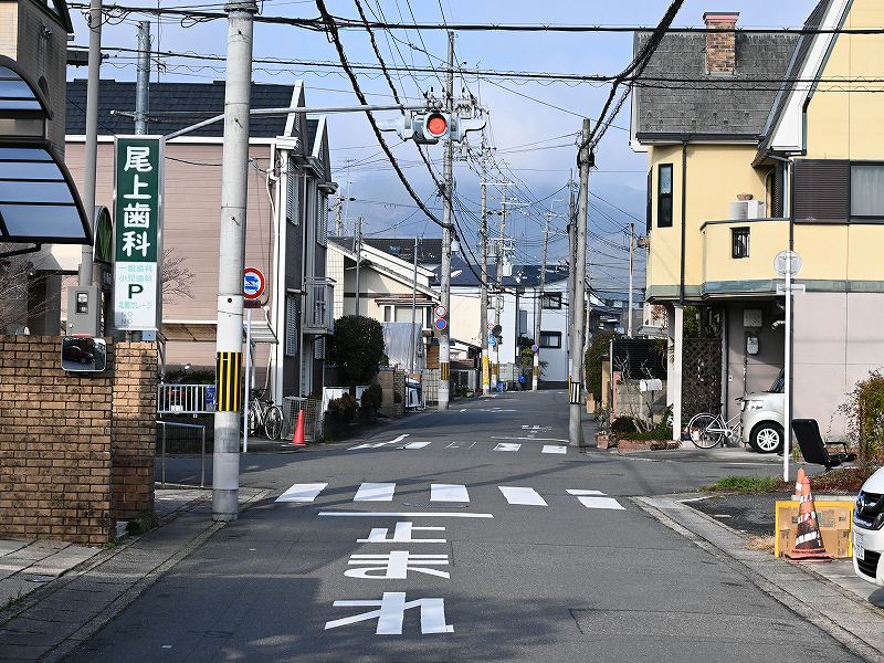 | 2025年3月22日撮影 京都府内は住宅地の路地などを中心にちらほら4方向1灯点滅を見ることができ、しかも珍しい種類のものもいくつか見られます。この交差点にあるのは小糸アルミ250mm1灯の所謂"外庇"世代の4方向1灯点滅です。そもそも250mmは圧倒的に内庇のものが多く、この所謂外庇の250mmは小糸アルミ250mmの丸型からA型アルミ灯器への過渡期の灯器と思われ、数はそう多くないです(三重県や岡山県、かつての宮城県など250mmのアルミ灯器の導入が早かった特定の地域でそれなりには見られます)。そのため、この灯器ベースの1灯点滅となるとかなり珍しいものと思われます。かつては奈良県にもあったようです。京都市内ではここともう1箇所あったようですが、そちらは既に撤去済です。平成7年製。 |