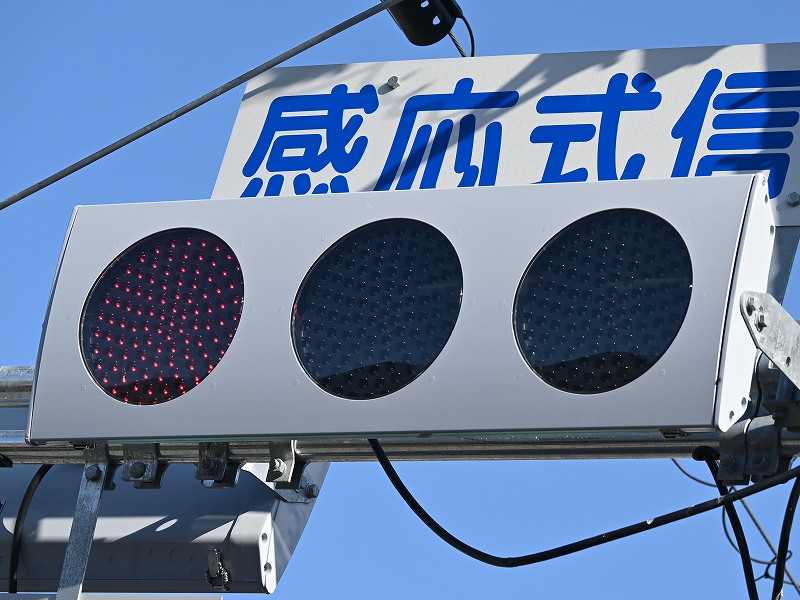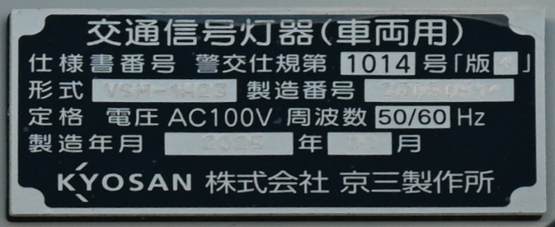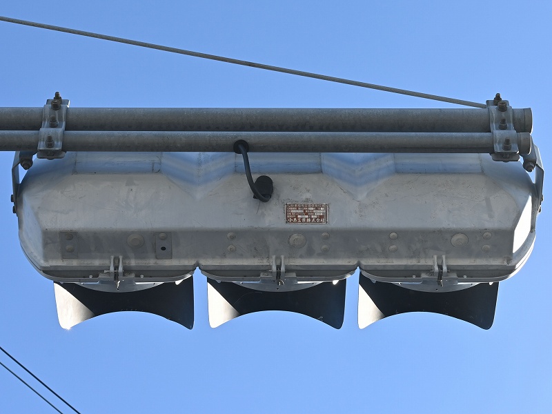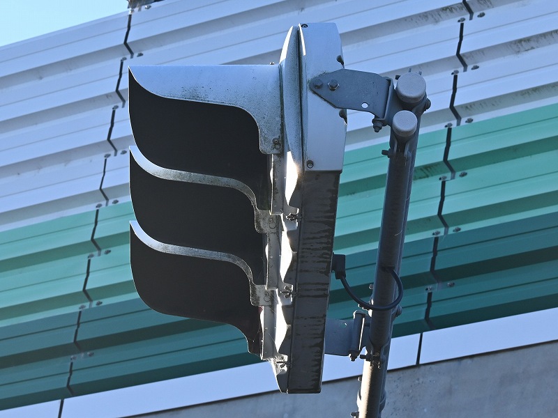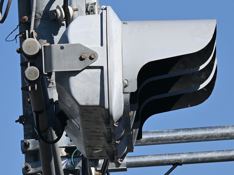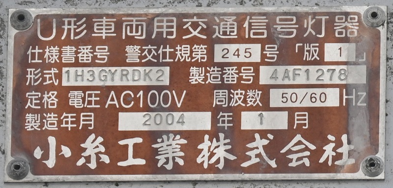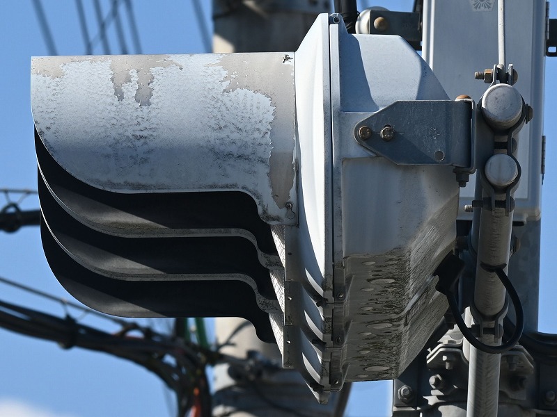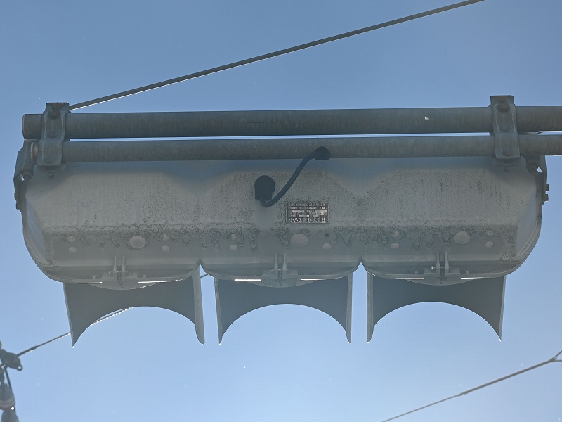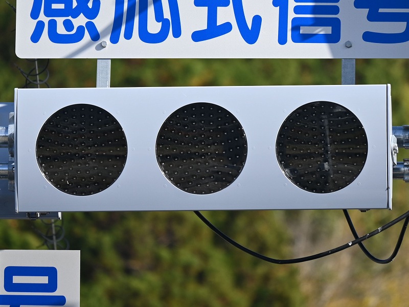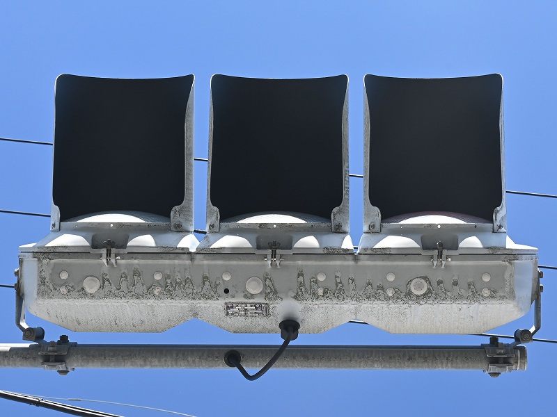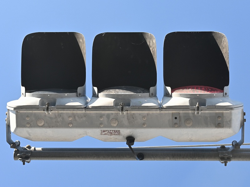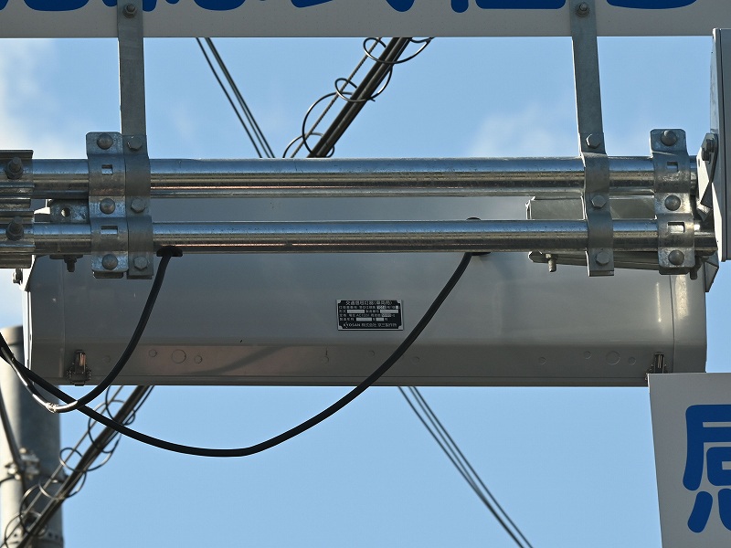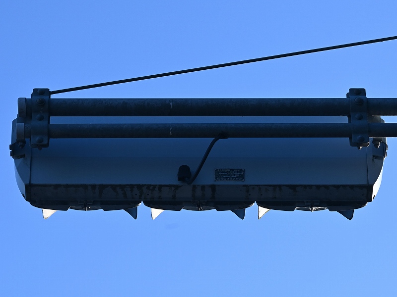 | 2025年11月29日撮影 国道24号沿いの丁字路にさらに鋭角に細い道路が交わるような形状の交差点です。その細い道路向けに赤黄赤配列の灯器が1基設置されています。元々は蒲鉾スフェリカルの赤黄赤でしたが、2025年に更新され、こちらもなんと赤黄赤が引き継がれました。しかも新品の低コストの赤黄赤灯器となっています。まさか低コスト世代になっても赤黄赤が引き継がれるとは思いませんでした。全国的にも大変珍しいと思います(そもそも電材低コスト筐体の赤黄赤自体ここと佐賀県唐津市の縦型しか確認されていません)。2025年になっても2つも赤黄赤が新たに設置されるなんてなんと奈良県は信号機マニア思いなのでしょうか(笑)。ただこの交差点ももしかしたら制御器交換のタイミングで左赤が点灯しなくなる変更があるかもしれません。こちらも黄は点灯しません。2025年9月製。赤黄赤灯器は電球式時代は2基ありましたが、低コスト灯器へ交換するタイミングで1基に減りました。また裏に付いている低コスト灯器は通常配列となっています。 |