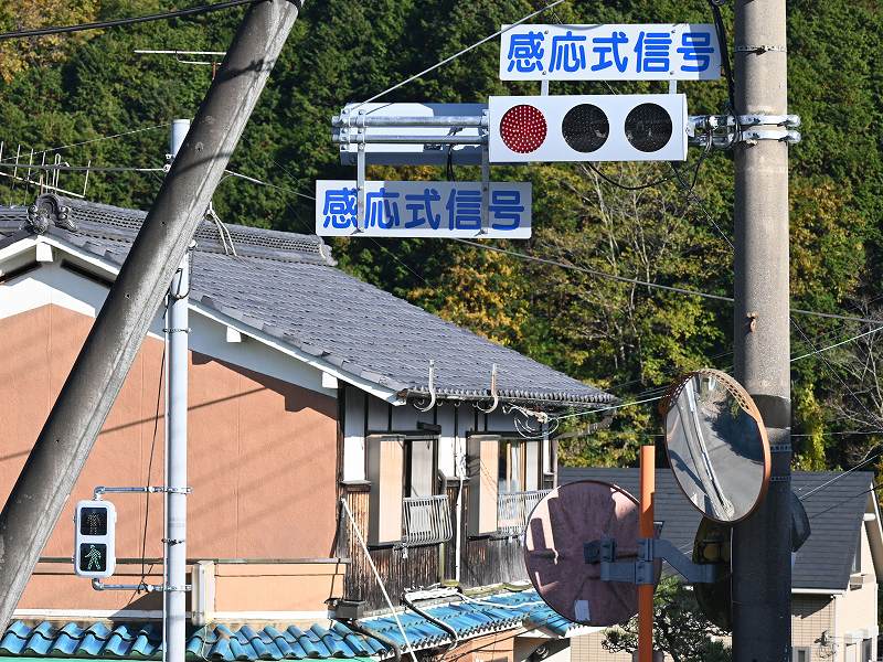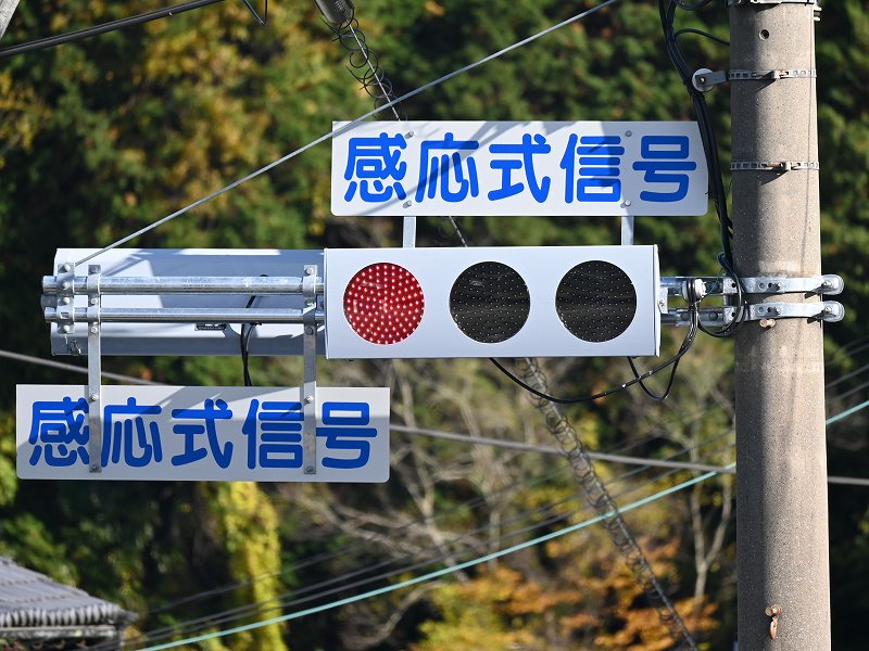 | 2016年11月5日撮影 こちらは旧都祁村の国道369号沿いの丁字路交差点に細い路地が斜めに交差する形状の交差点です。細い路地側に赤黄赤灯器が設置されています。従道側が青になると、この灯器の左赤が点滅し、黄に変わるとこの灯器の右赤が点灯し、黄は使用しません。灯器は小糸の集約LEDとなっておりルーバー付きとなっています。平成13年製です。 | |