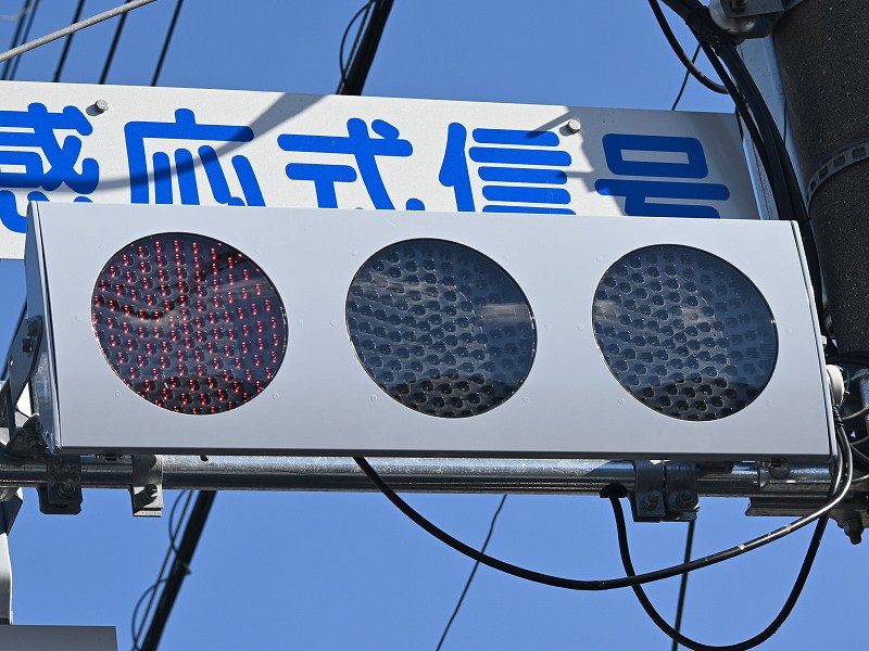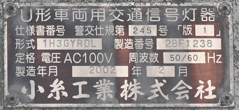 2018年9月2日撮影 2025年11月29日再撮影 奈良県ではLED世代の赤黄赤配列の灯器がいくつか設置されています。全国的にも非常に珍しいです。この交差点にあるのは小糸のレンズユニットタイプのLEDベースの赤黄赤です。レンズユニットタイプ自体見られる県が限られる上、その変則配列となると他では見られないのではと思います。他の赤黄赤と同様に残念ながら(?)黄は点灯せず、青の代わりに左赤が点滅し、一時停止してからの進行を促しています。従道が2つあり、そのうち交通量の少ない細い道路側にこの灯器が1基設置されています。2002年製で形式は1H3GYRDLとなっており、赤黄赤配列であることは示されていません。 | |