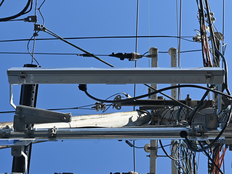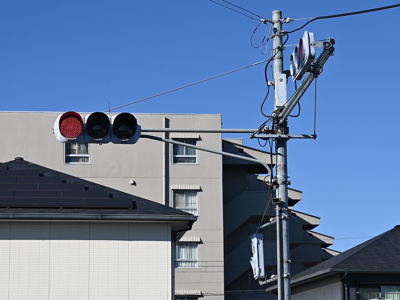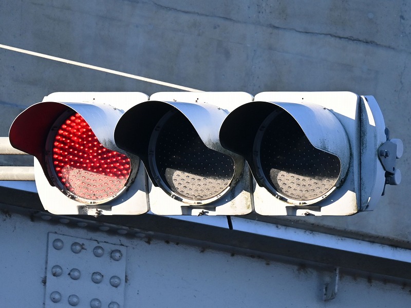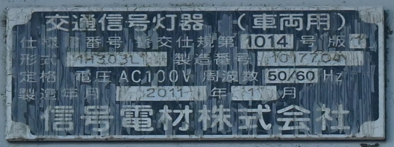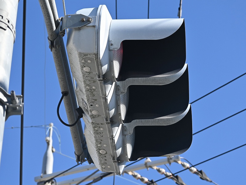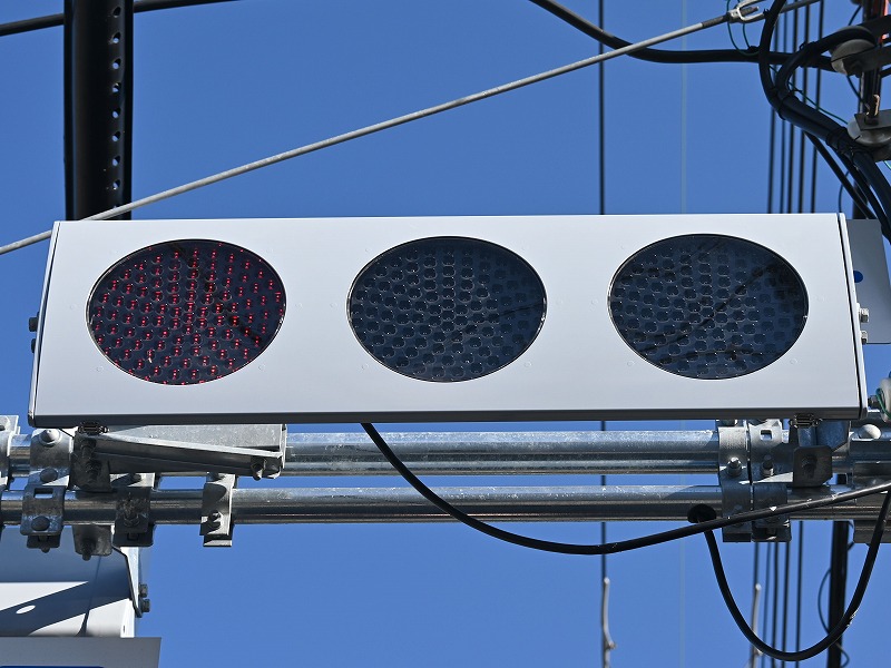 | 2015年9月26日撮影 2025年11月29日再撮影 踏切に隣接する交差点に設置されている電材薄型の赤黄赤灯器(おそらく・黄は点灯しないので真ん中が黄である確証なし)です。2011年1月製です。踏切のすぐ近くに交差点があるので踏切から来た側の車に一時停止してから交差点に進入するようにしているようです。左赤点滅→赤→という制御になっています。2025年に10年ぶりに再訪しましたが、なぜかサイクルが変更になり、左赤点滅→左赤点灯→を繰り返して右赤は点灯しなくなりました。左赤が点灯する信号サイクルは矢印付でないものではほとんど他で見ることはありません。なぜ右赤が点灯しなくなったかは不明です。実際見ると非常に違和感があります。 | |