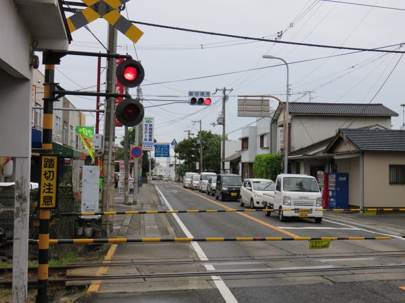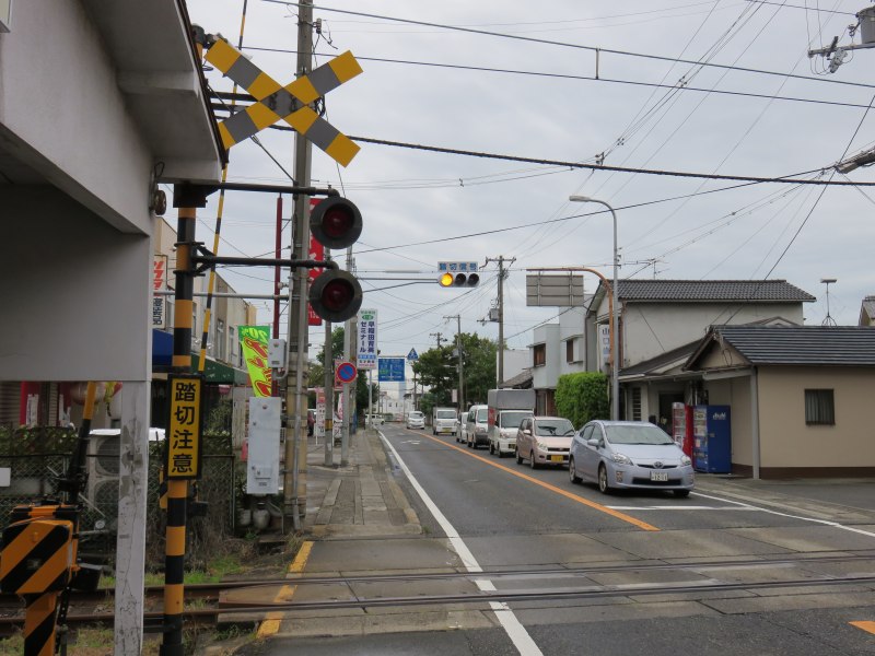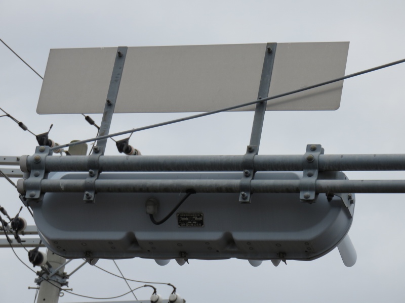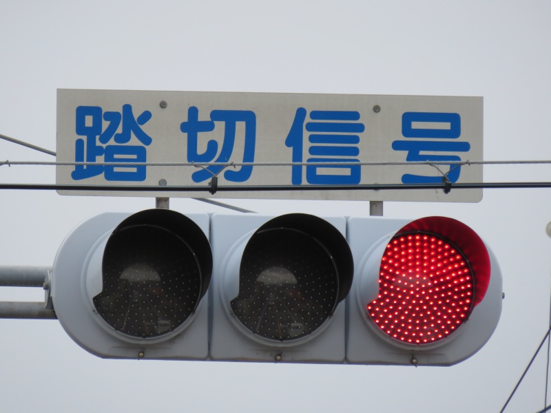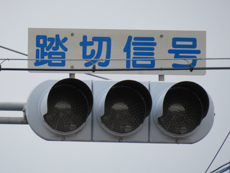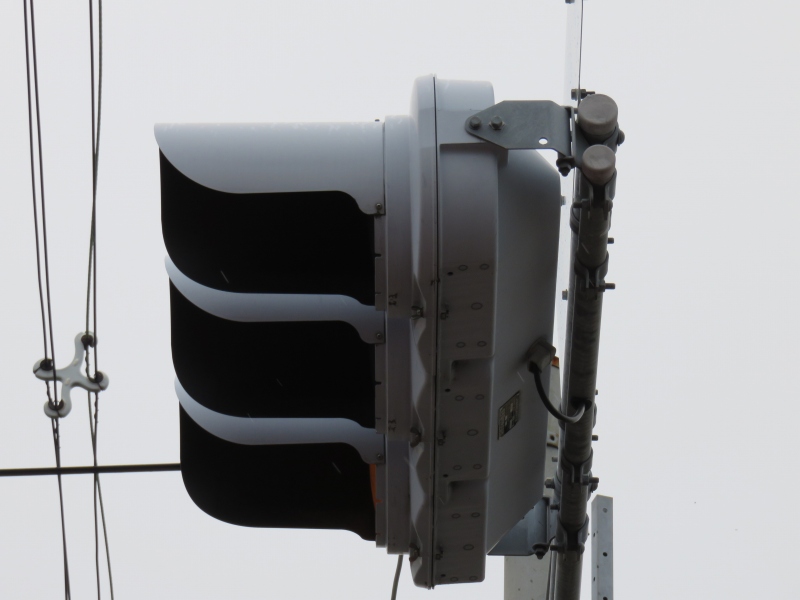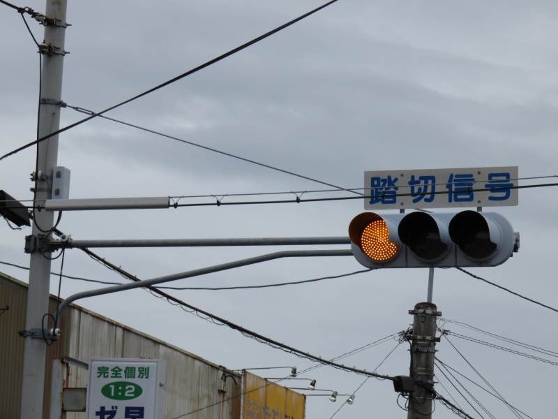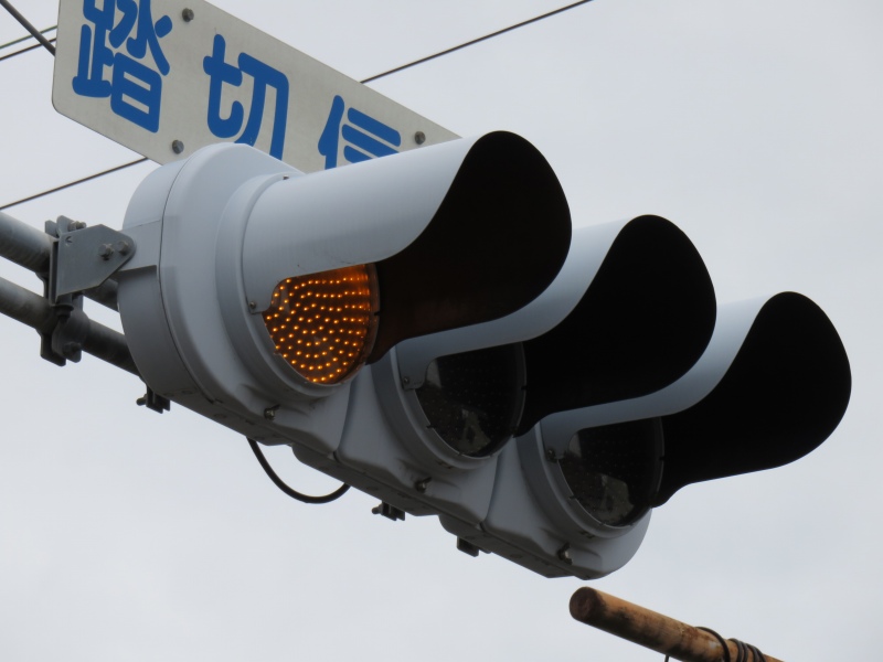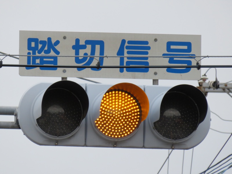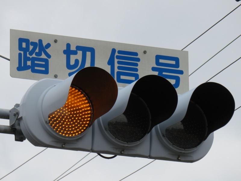 交差点に隣接する踏切にある踏切信号です。通常は左黄点滅で、踏切の遮断機が降りると→黄→赤となります。灯器は電材一体LEDです。大阪府内でこのように左の黄を使用する灯器は非常に珍しいです。対向側は通常の青黄赤灯器となっていて交差点と連動し、また踏切遮断時は赤になります。