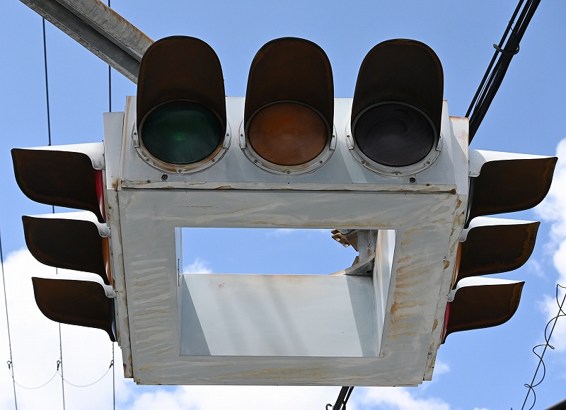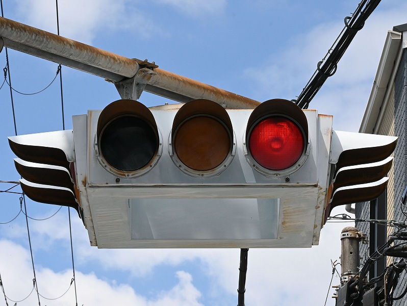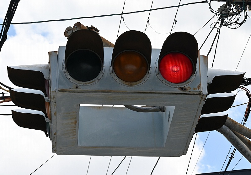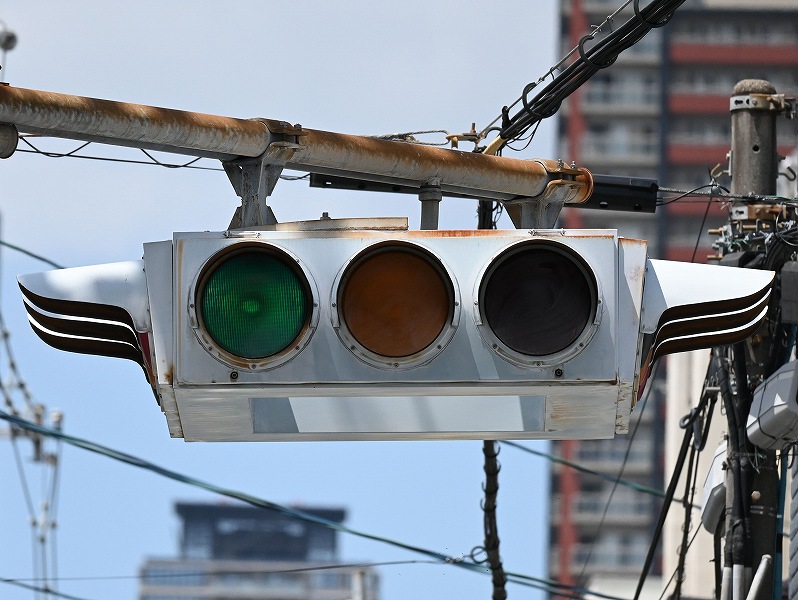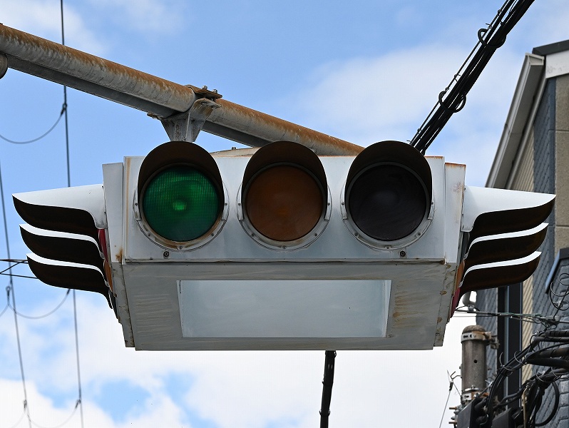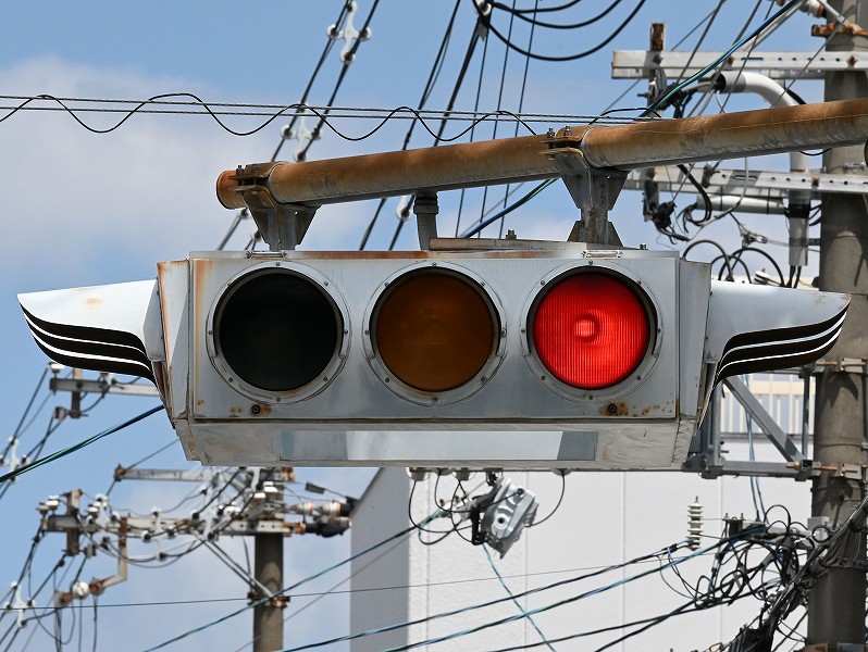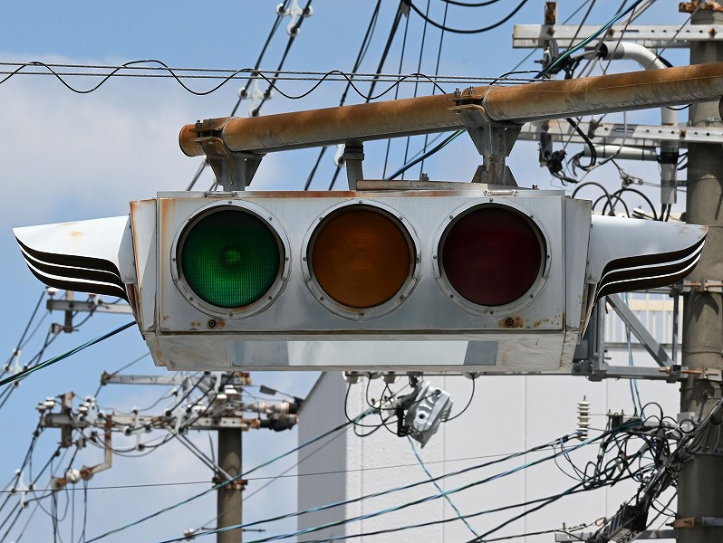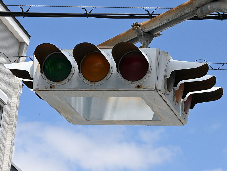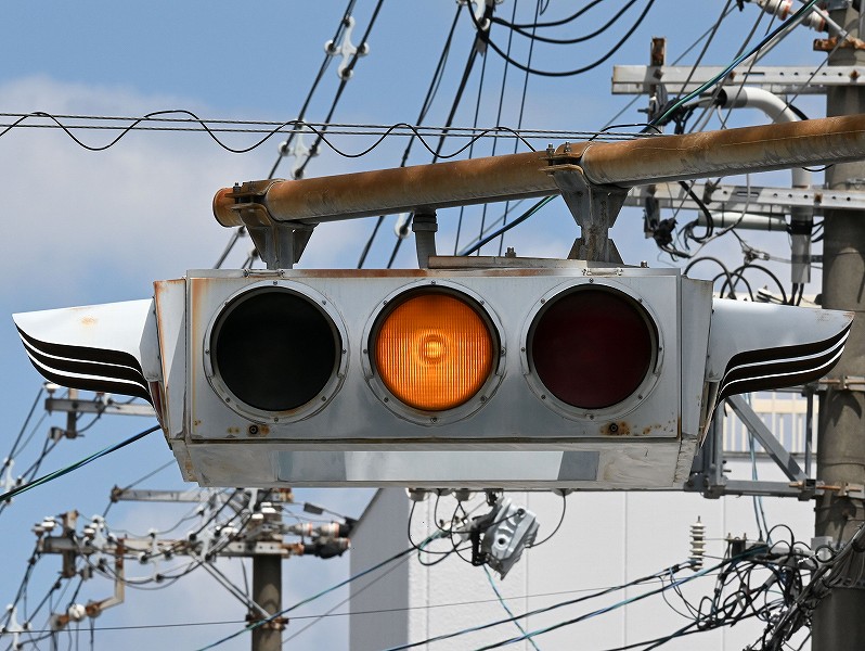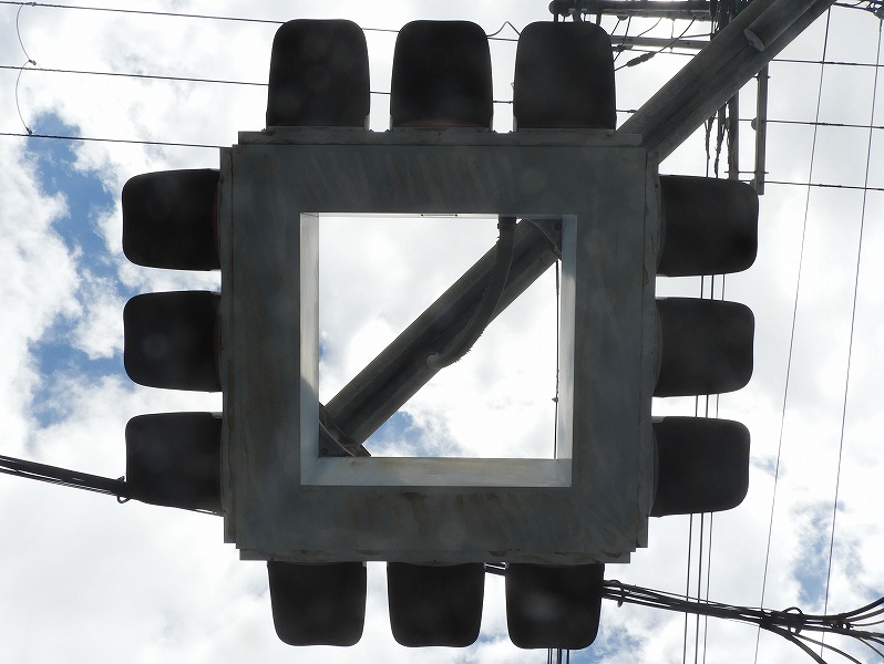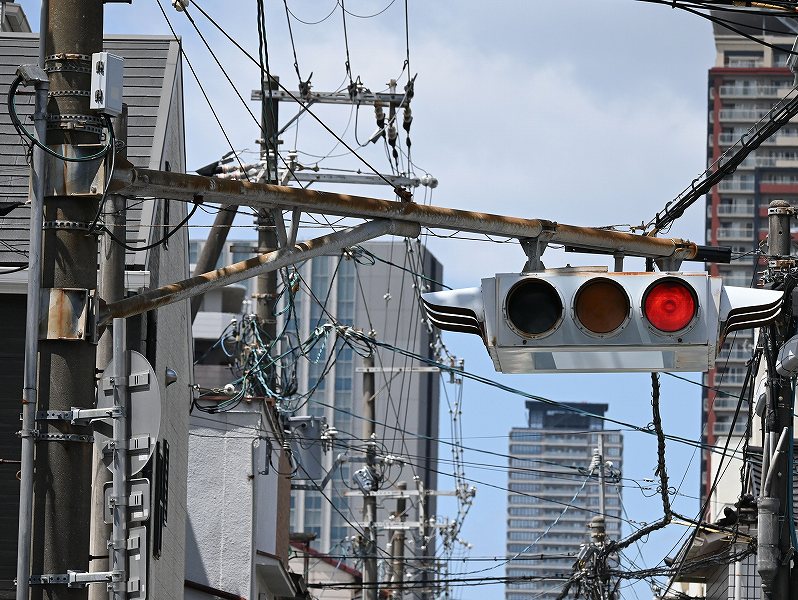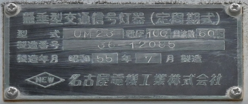 大阪市内の狭い交差点に設置されている名古屋電機製の集約灯器です。名古屋電機製の集約灯器自体、宮城県で歩灯・車灯一体のものがたくさんある以外、群馬と大阪のこの場所の2基しか現在はないため、非常に貴重です。因みに大阪府内ではかつて吹田市にも同一のものが1基あったそうです。昭和55年製です。2024年8月に再度行きましたが、まだ残っていました。