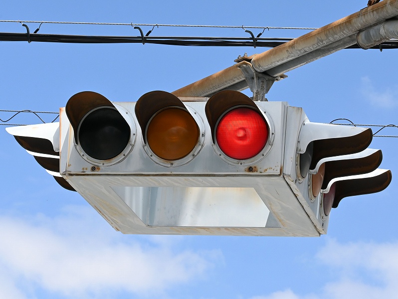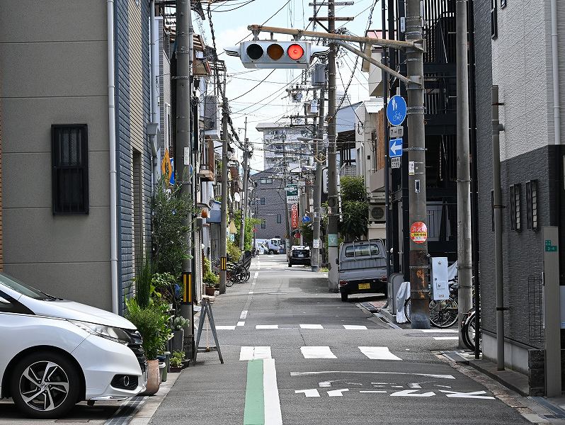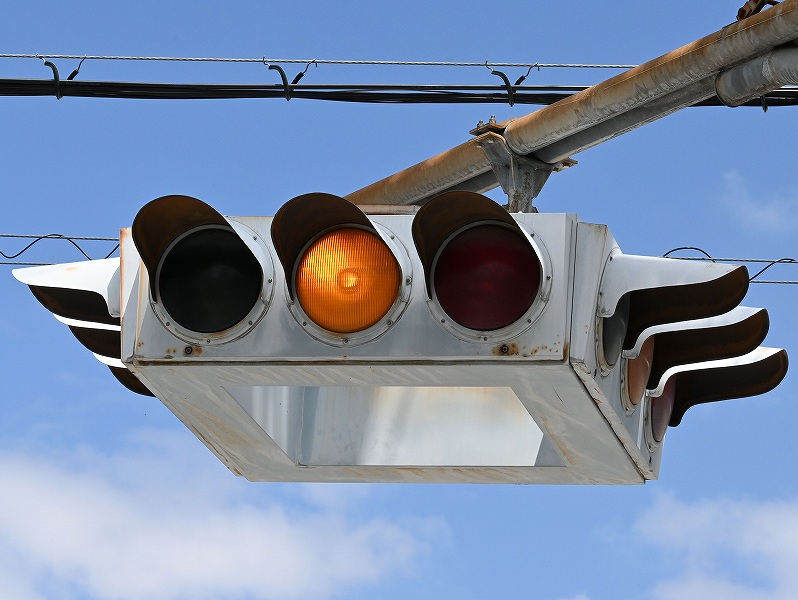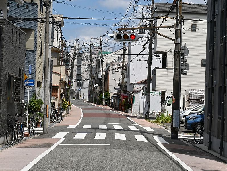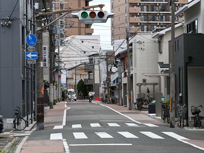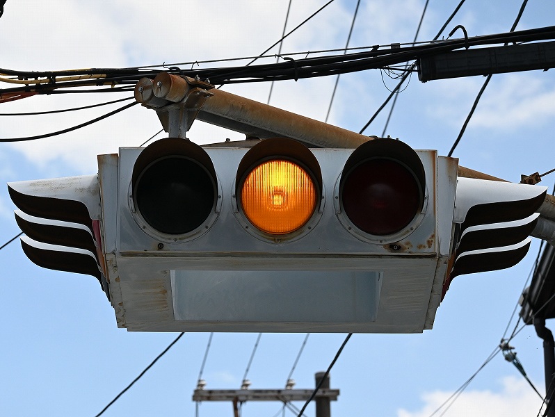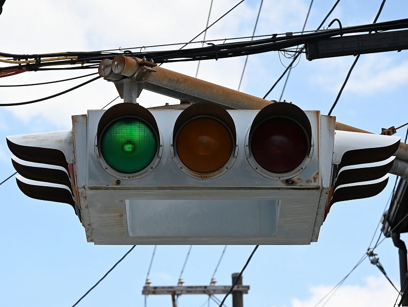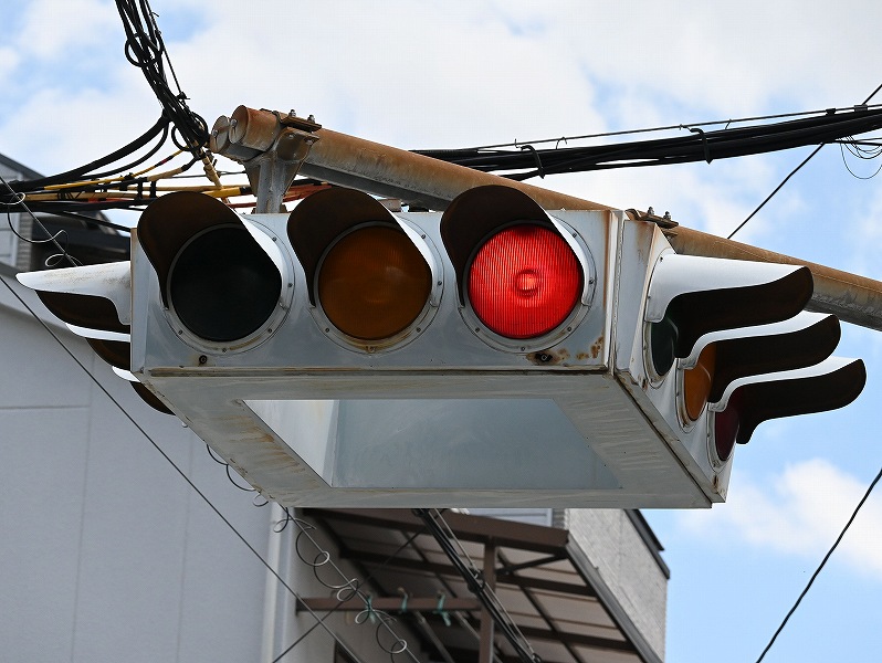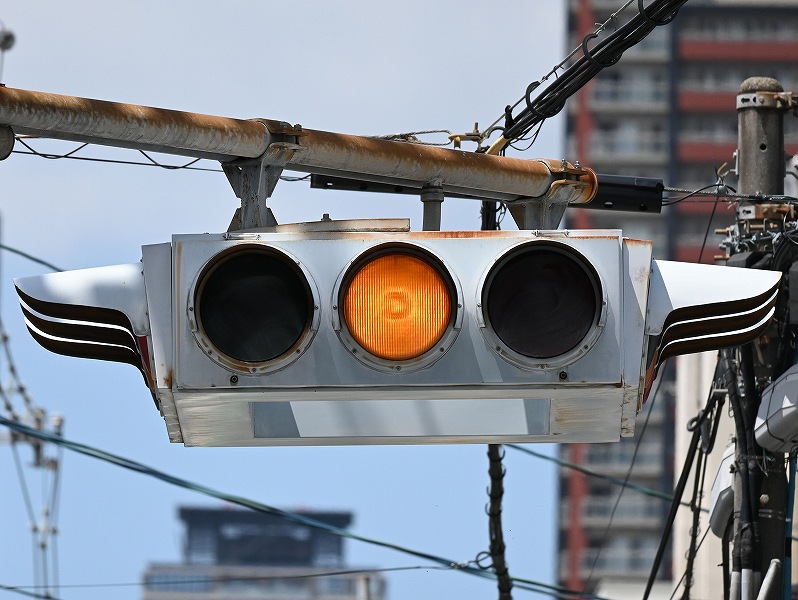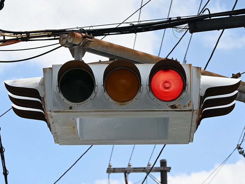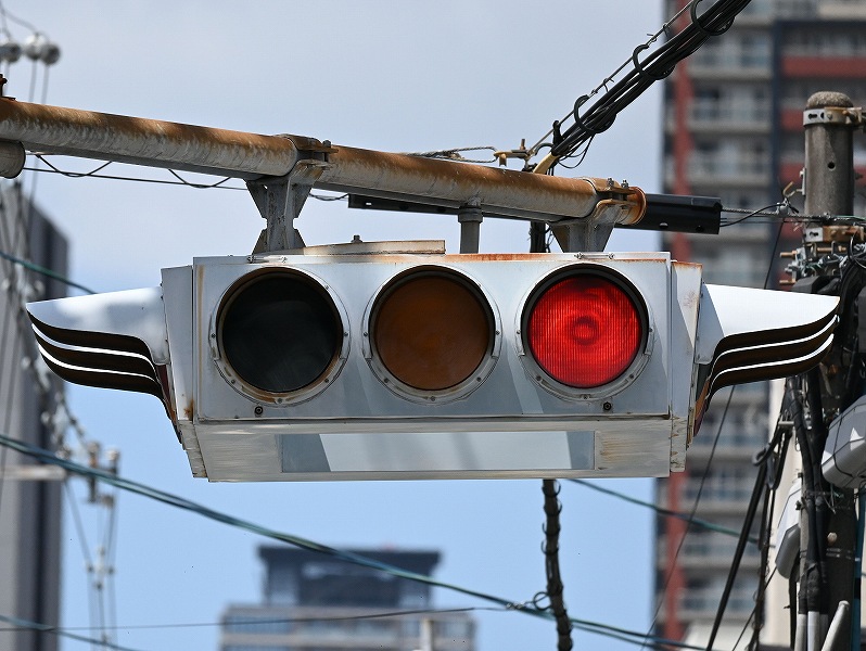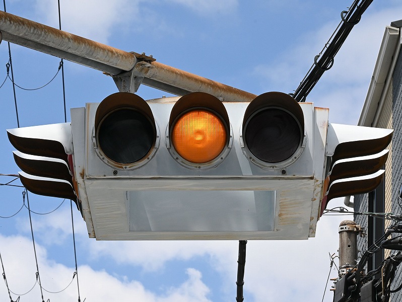 大阪市内の狭い交差点に設置されている名古屋電機製の集約灯器です。名古屋電機製の集約灯器自体、宮城県で歩灯・車灯一体のものがたくさんある以外、群馬と大阪のこの場所の2基しか現在はないため、非常に貴重です。因みに大阪府内ではかつて吹田市にも同一のものが1基あったそうです。昭和55年製です。2024年8月に再度行きましたが、まだ残っていました。
