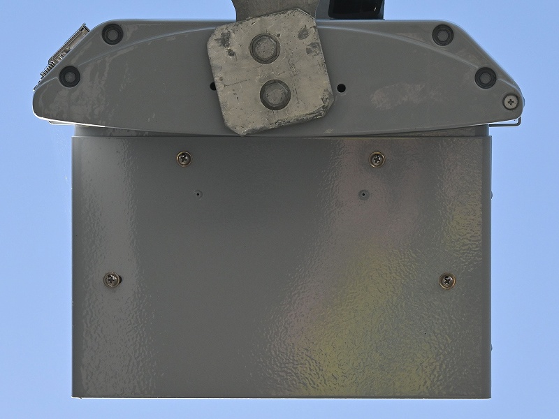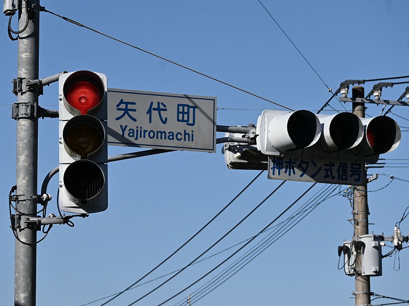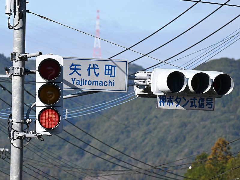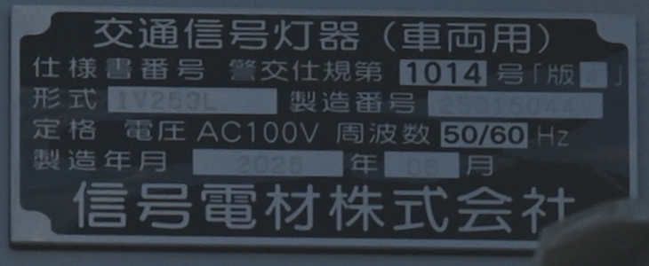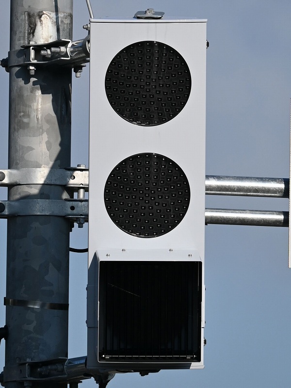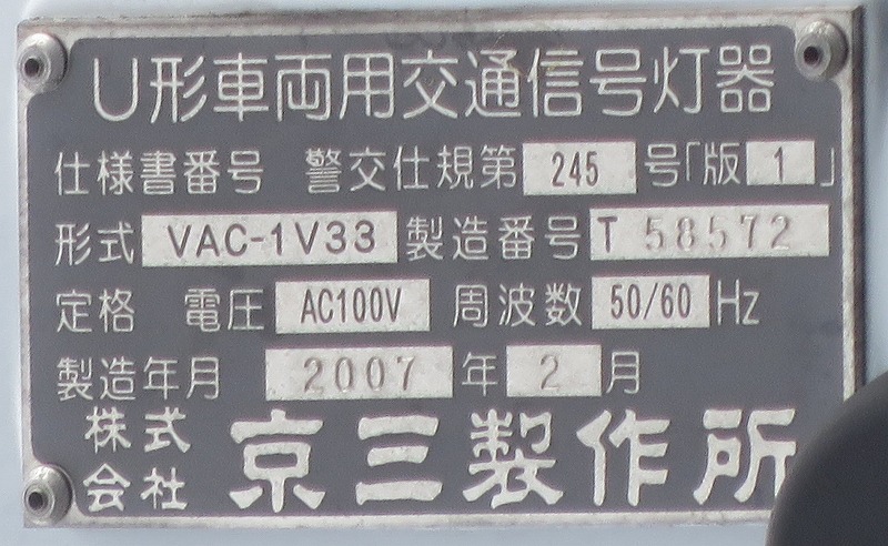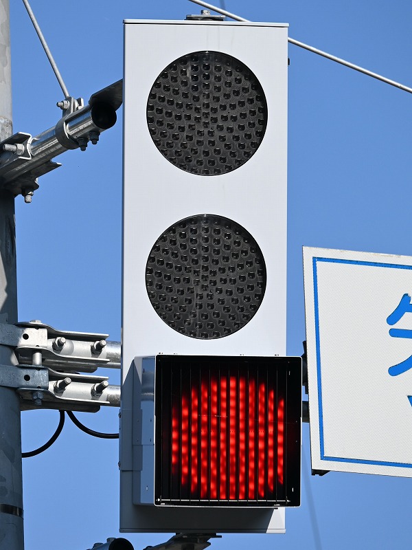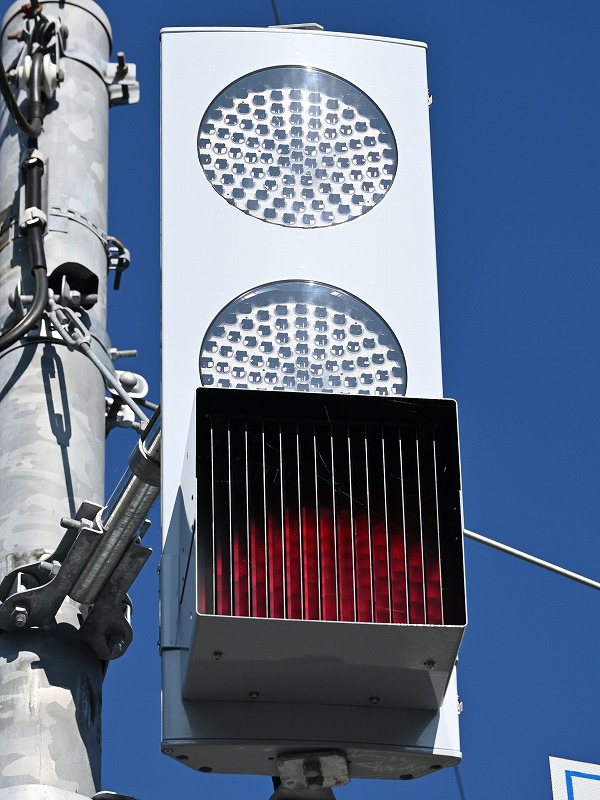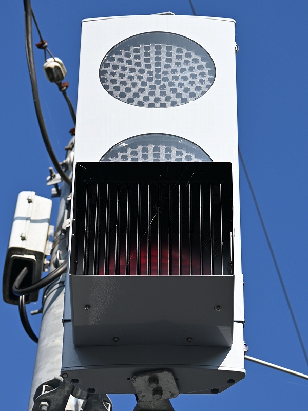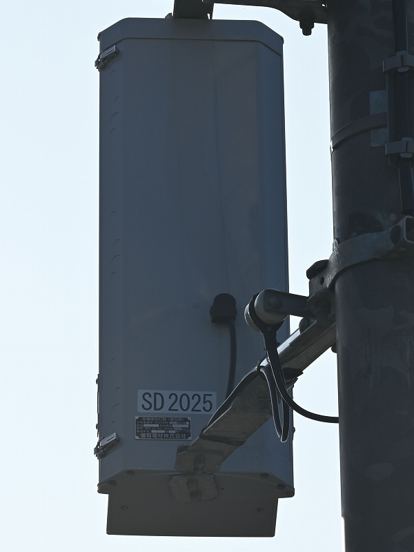 | (情報提供感謝:梶さん) 2024年1月2日撮影、2025年8月15日更新後撮影 唐津市の旧北波多村の県道沿いの押しボタン式交差点の従道側にある縦型の赤黄赤灯器です。Y字路になっており、主道(県道)側は通常の3灯となっています。押しボタンが押されていないときは主道側は青、この赤黄赤がある従道側は下の赤が点滅しています。押しボタンを押すと主道側が→黄→赤と変わるのに合わせて、この赤黄赤も→黄→赤(上赤)と変わります。灯器は京三製の2002型灯器で、2007年製です。縦の赤黄赤自体全国的に大変珍しく、しかもこの交差点は基本的に常時下の赤が点滅しているという非常に貴重な交差点です。目立った信号機ネタが多くはない佐賀県ではトップクラスのネタかと思います。因みに更新前も赤黄赤で、灯器は樹脂丸型だったそうです。2024年に9年ぶりに見に行きました。その後2025年に入り、灯器が更新されましたが、なんと赤黄赤は引き継がれました!サイクルは電球式時代と全く同じです!更新に伴って、通常の配列で赤が点滅するパターンになるのが全国的にも大半である中でまさか赤黄赤のまま更新されるとは驚きました!電材低コストで、しかも縦型の赤黄赤、そして電球式時代と同じく下赤だけルーバー付きと本当にそのままの感じで交換されましたが、低コスト灯器で黄と上赤の庇がなく、下赤は四角ルーバーとなったため、電球式時代よりインパクトが増している気がします。2025年6月製で信号電材純正のものです。これを以って3世代にわたって赤黄赤が引き継がれたことになります(樹脂丸型→2002型→電材低コスト)。 |
