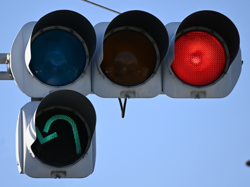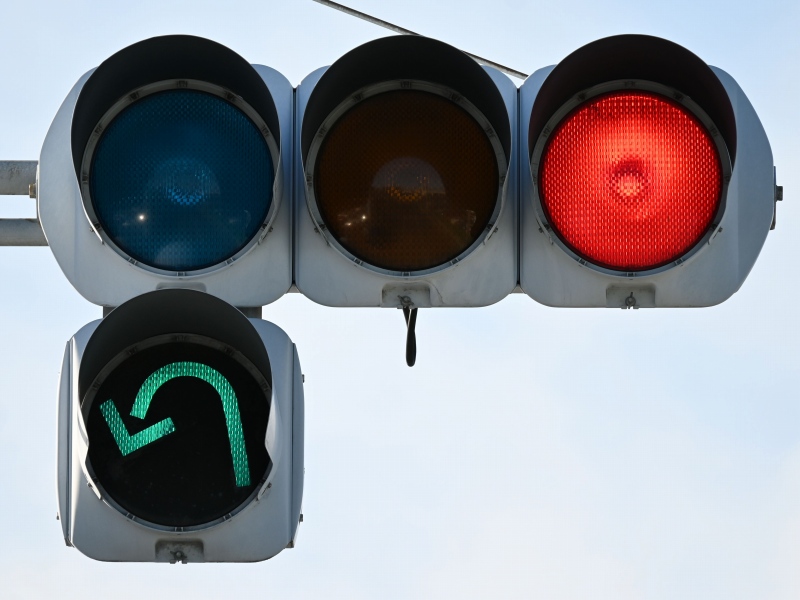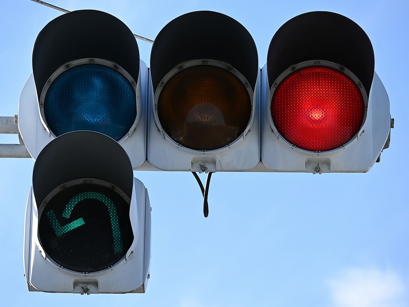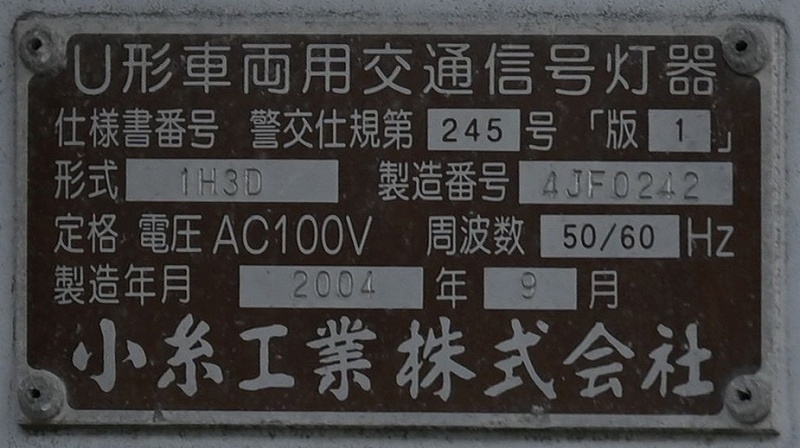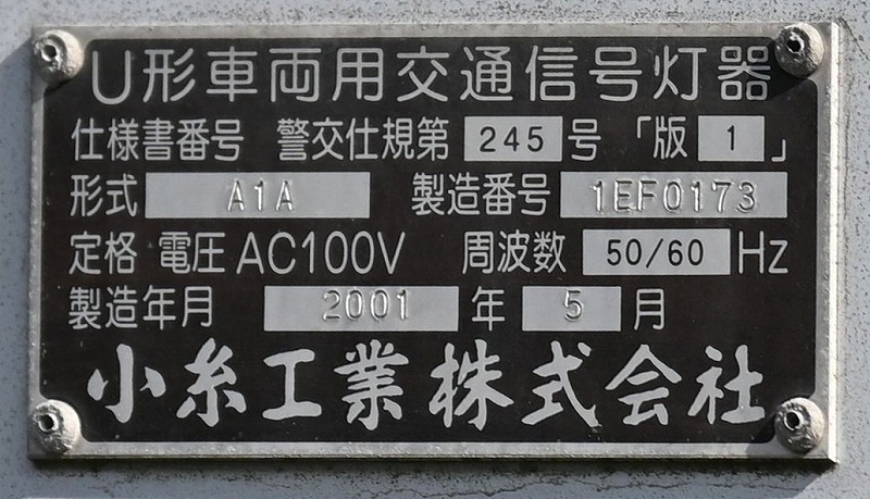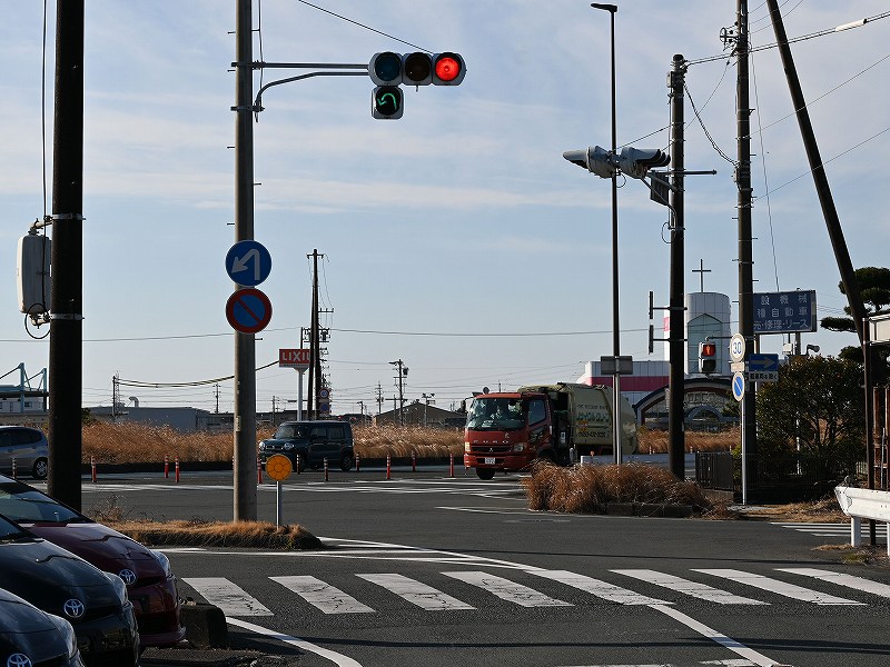 浜松市の国道1号バイパスの交差点の従道側に設置されている灯器です。この道路からは左手前(国道1号静岡市方面)にしか行けないことになっており、矢印もそれを強調するためか交差点の形状を忠実に表した曲がった矢印となっています。通常であれば左斜め下の矢印を設置すると想われます。このような変形矢印は以前はわずかにありましたが、最近では撤去が進み、ほとんど見られなくなりました。灯器は小糸製のアルミ灯器で、2001年製となっています。2023年2月に再度訪問しましたが、まだちゃんと残っていました。