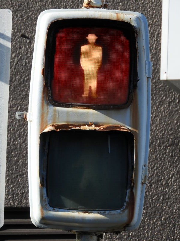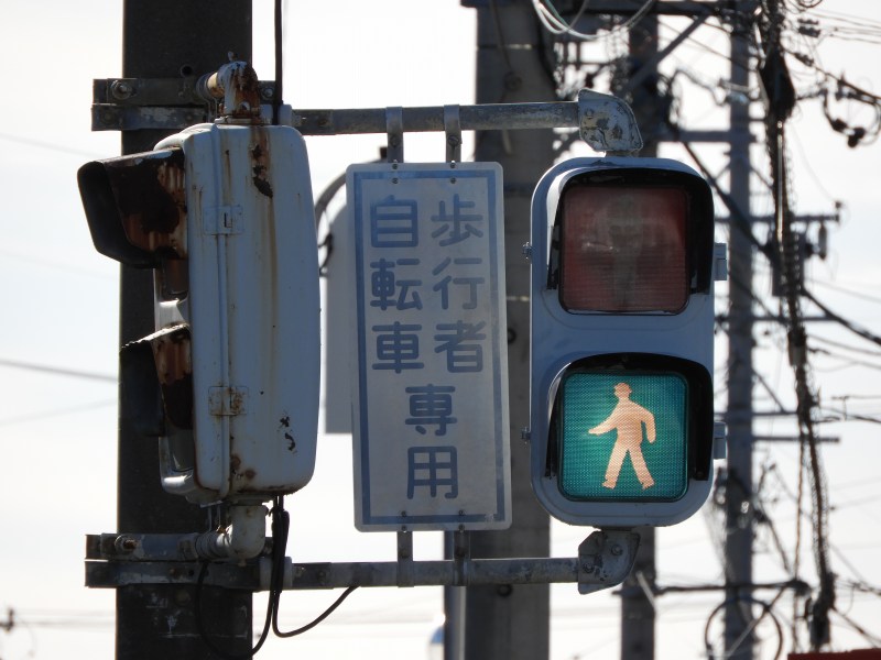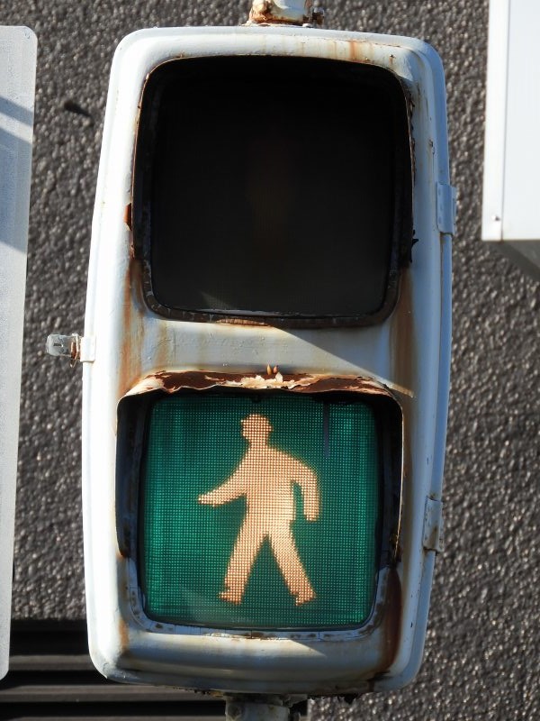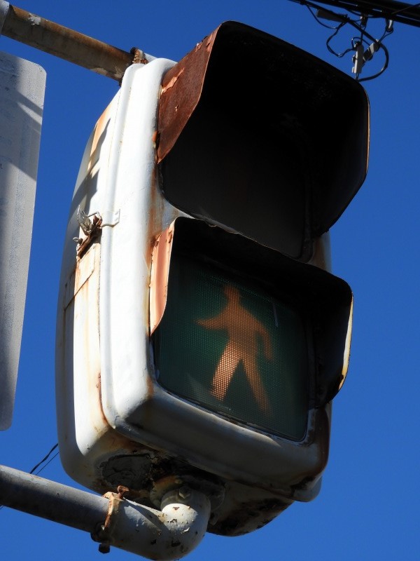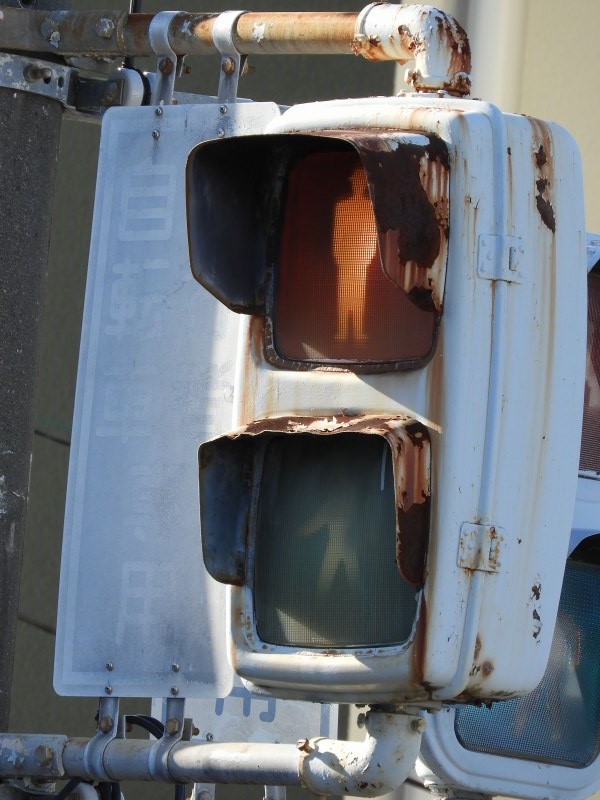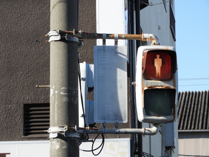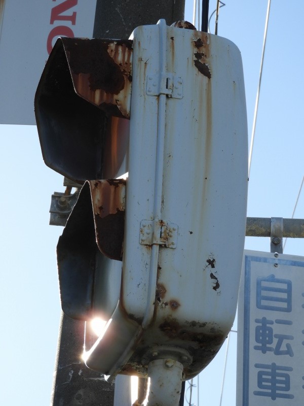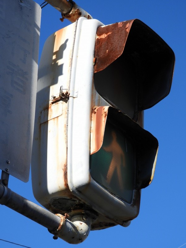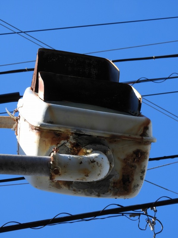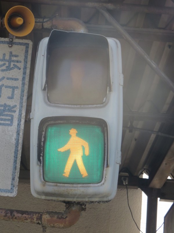 1と同じ世代の古い歩灯です。静岡市にもありました。こちらもレンズは既に交換されていますが、銘板が横に付いていて、青の庇が短いタイプで非常に貴重です。