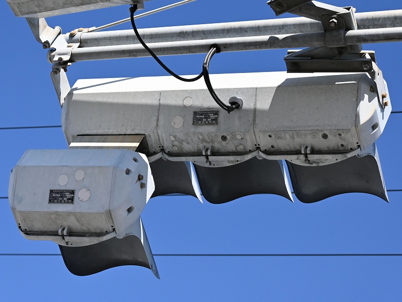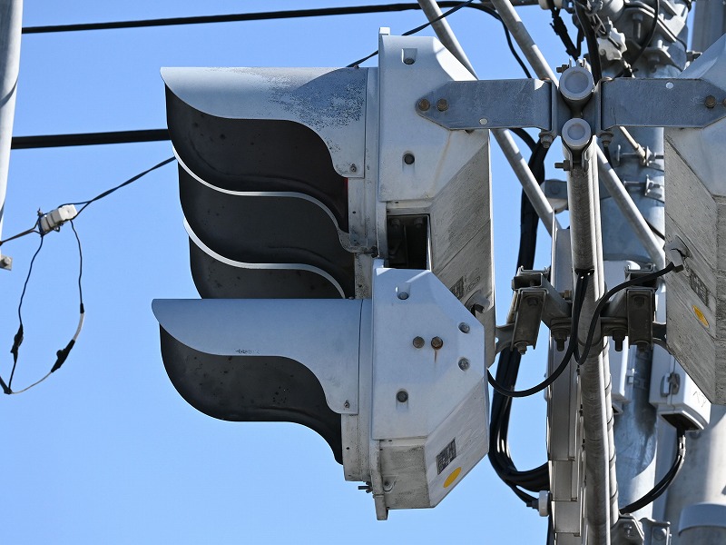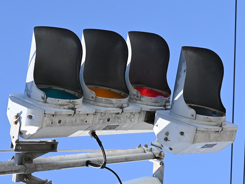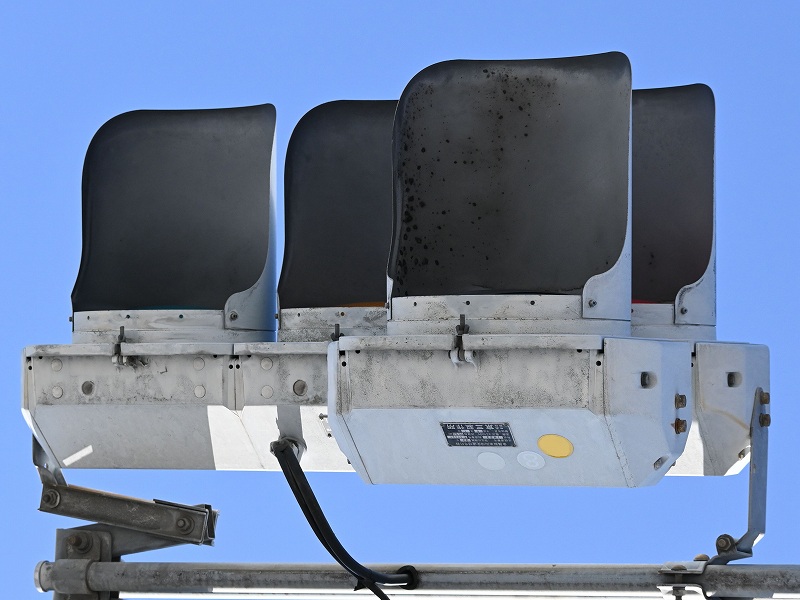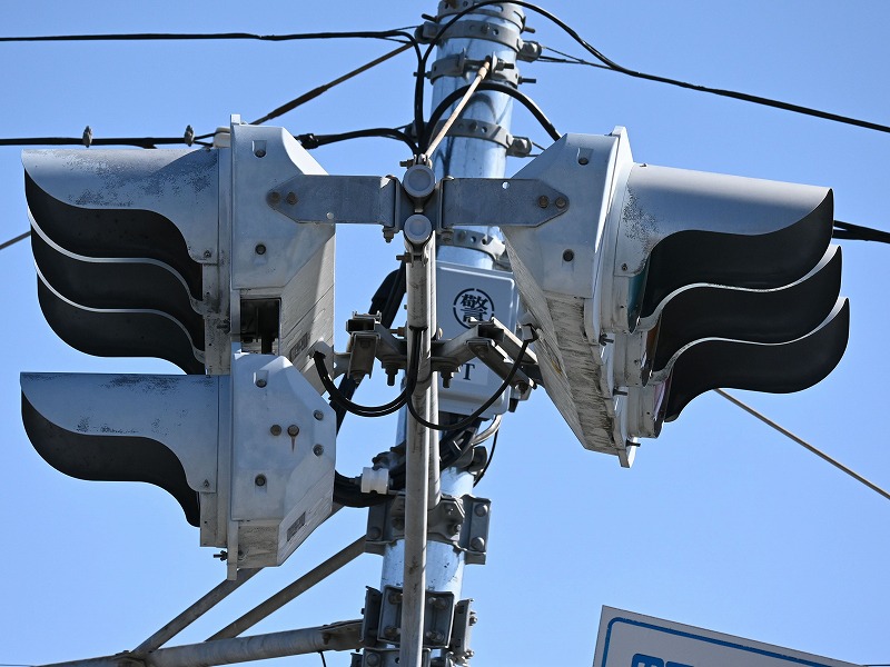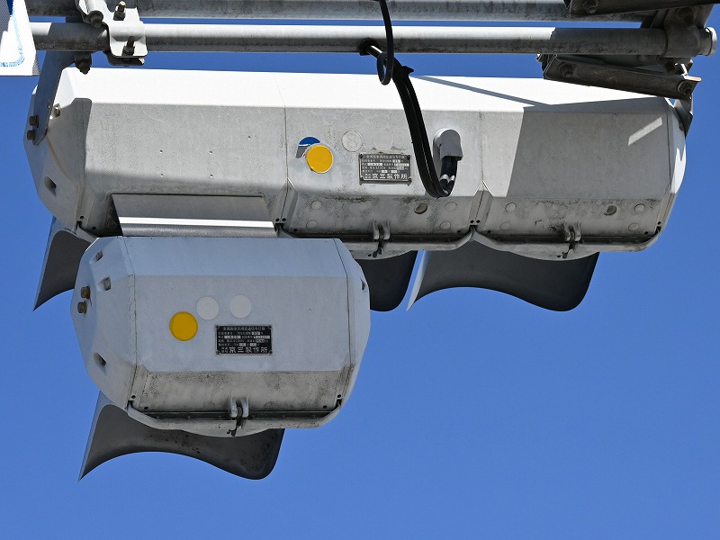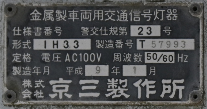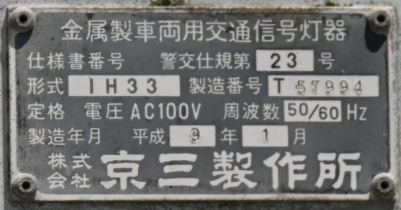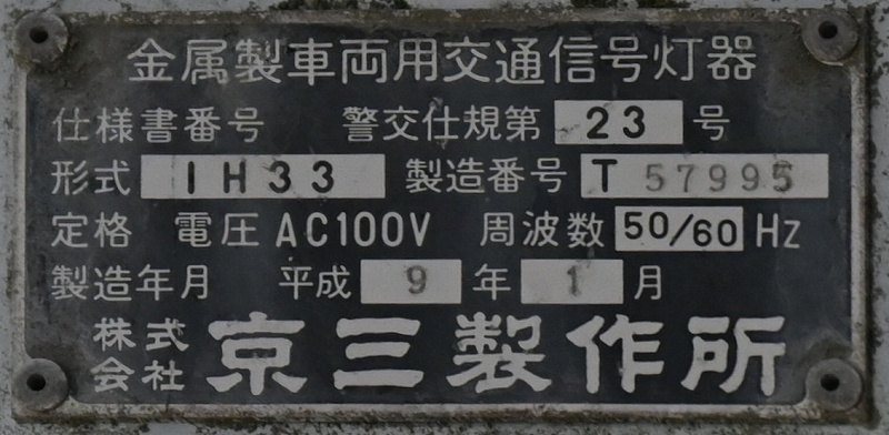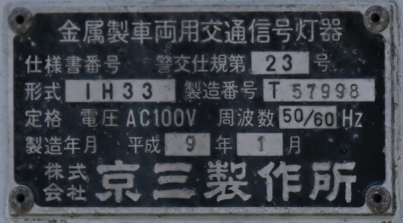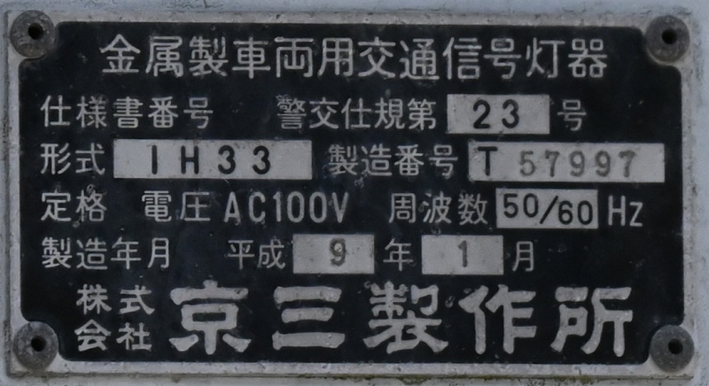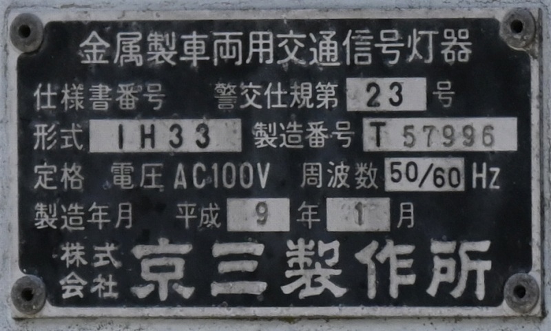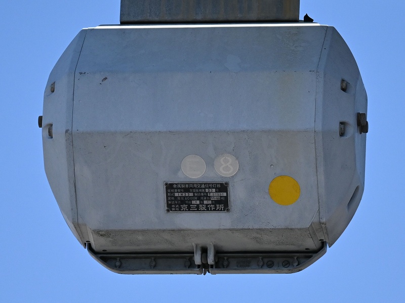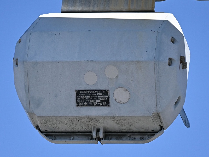2024年3月3日撮影 京三セパのブツブツレンズ搭載の矢印灯器ですが、なぜか左右に耳のようなものが付けられています。この交差点は1方向に3基も右折矢印があるのですが、3基全てに耳のようなものがあります。銘板を見てみると形式がいずれも1H33となっていて、なぜか3灯と同じ形式になっており、元々は3灯として製造されたものを矢印灯器に加工したのかもしれませんね。平成9年製です。 |