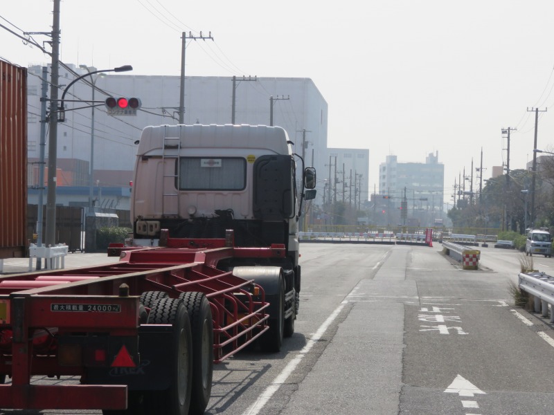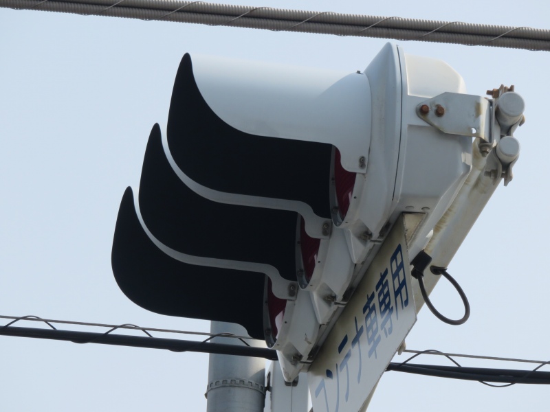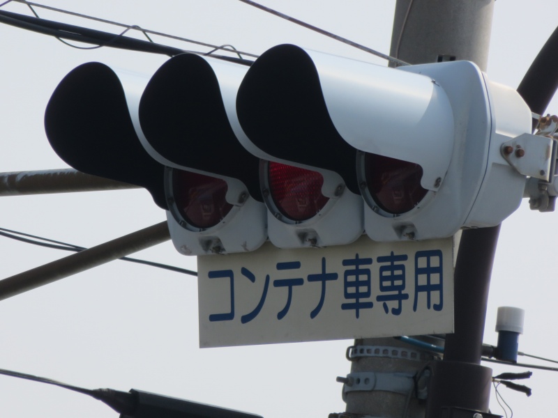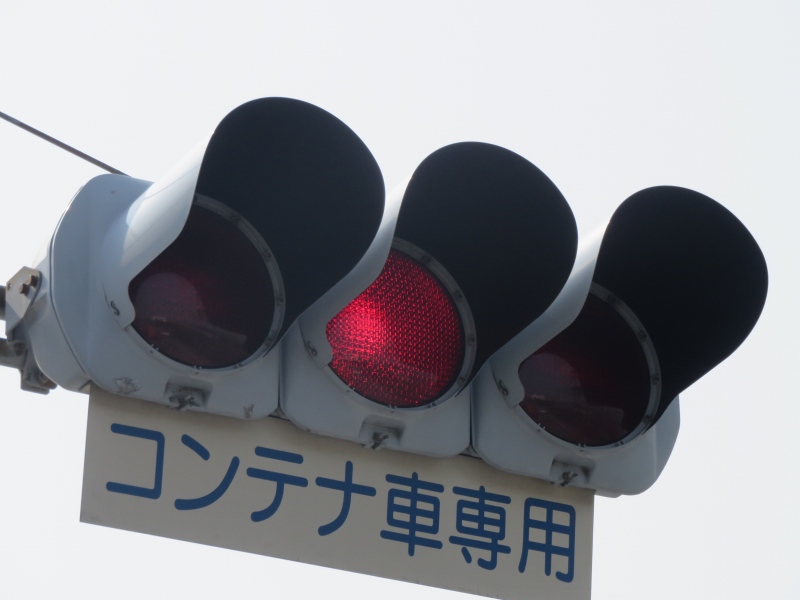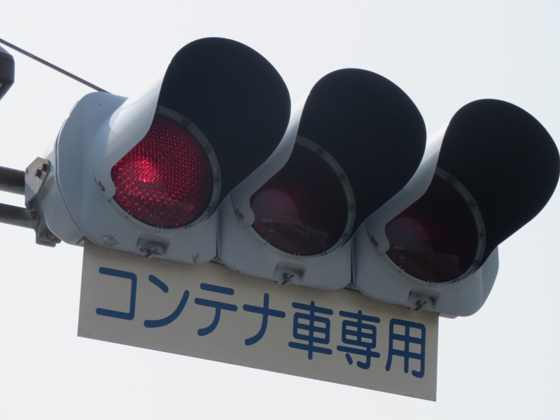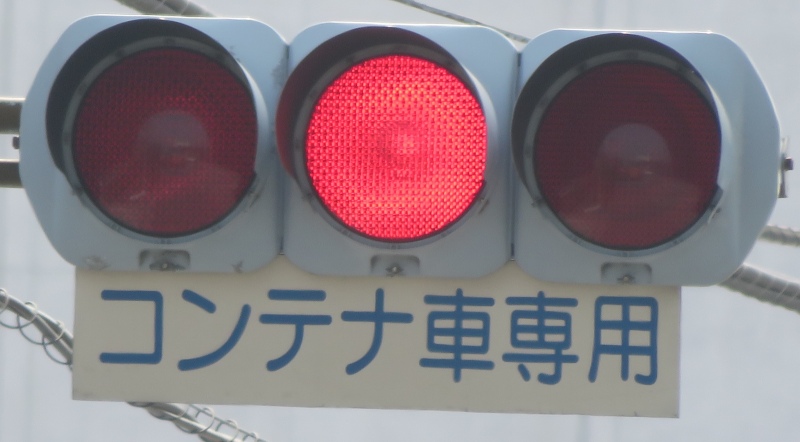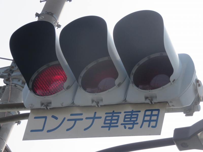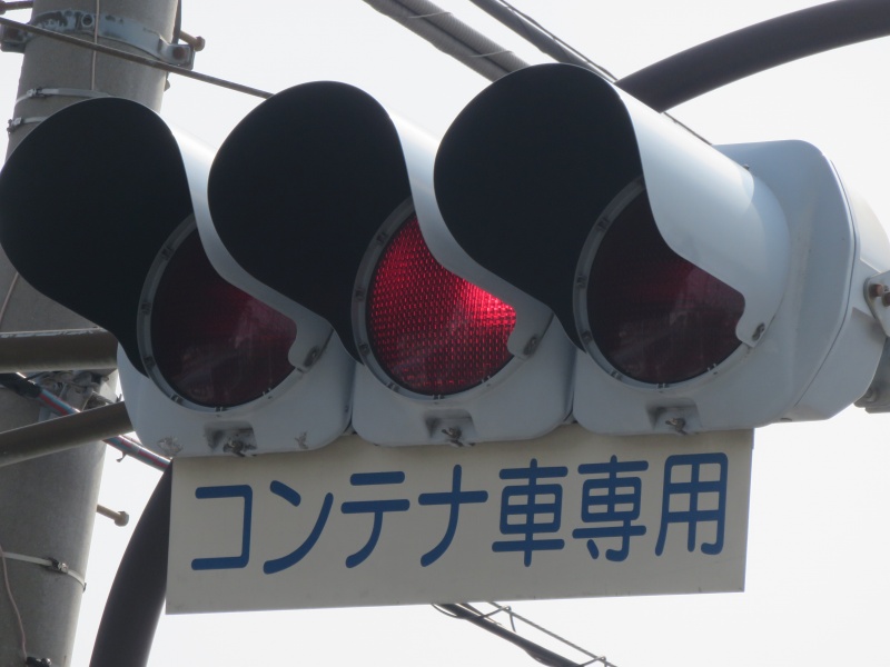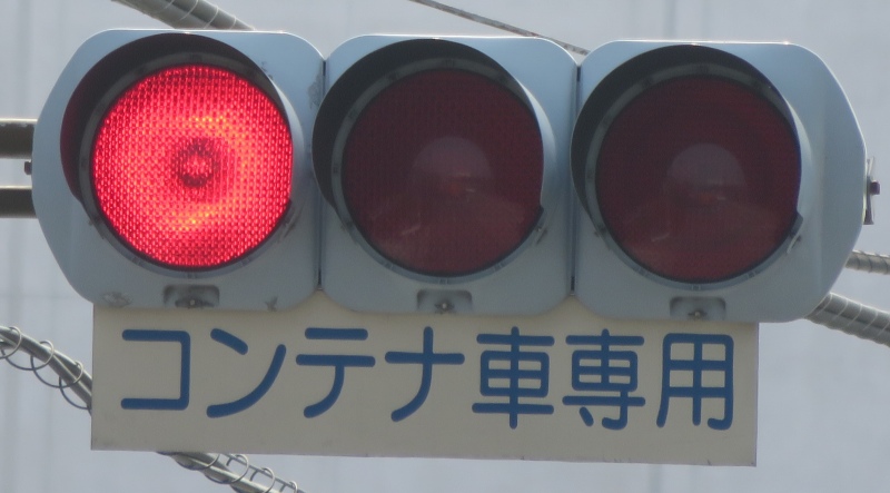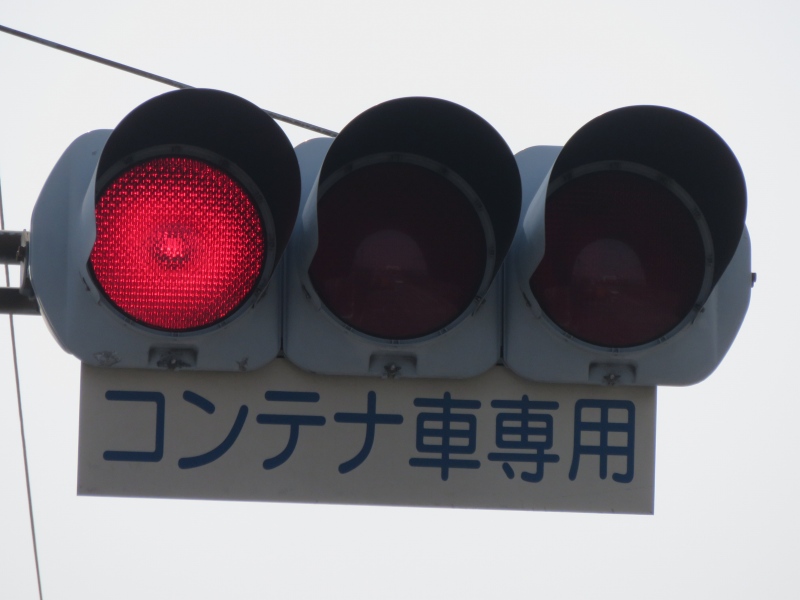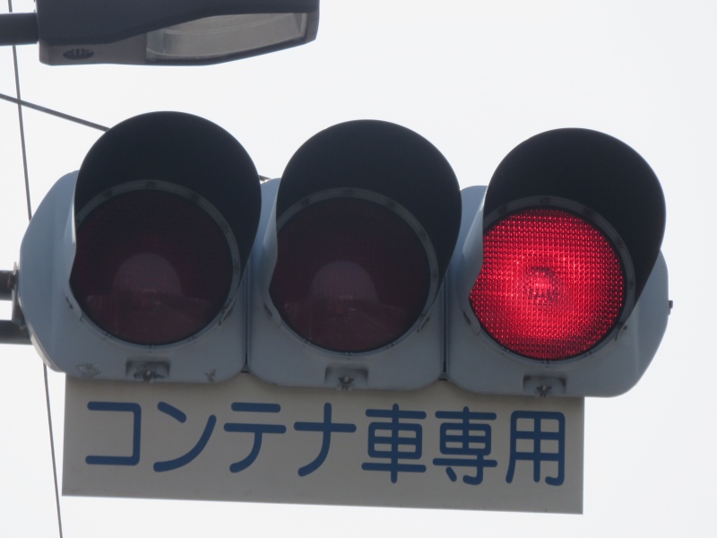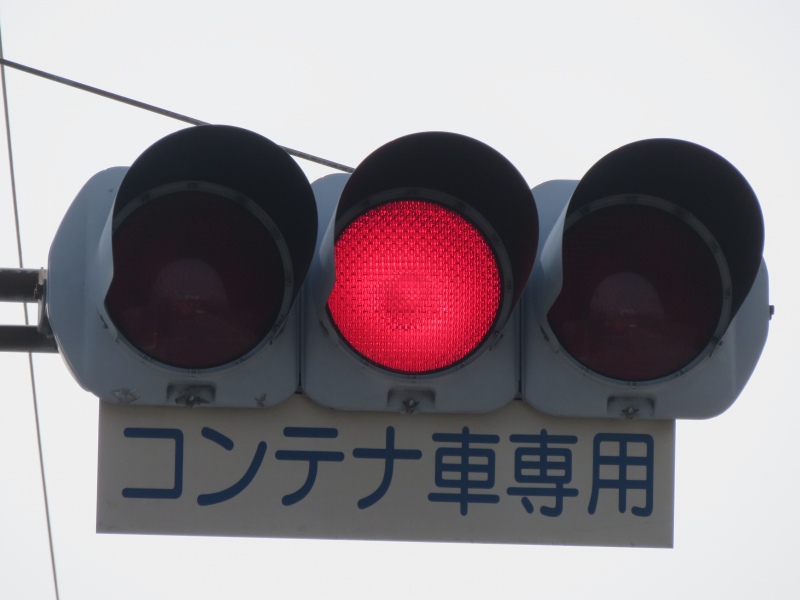 | 東京のコンテナターミナルにある信号機です。 全国的にもここと鹿児島の志布志にしかない、赤しかない灯器です。非常に不思議な信号機ですね。通常左赤と真ん中赤が交互に点滅していて、押しボタンを押すと右の赤が点灯して歩灯が青になるというサイクルです。 左と真ん中の赤点灯は非常に違和感ありますね。撮影時は土日だったので、車はほとんど通りませんでした。 |