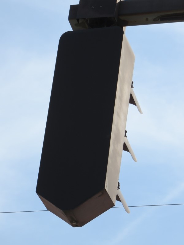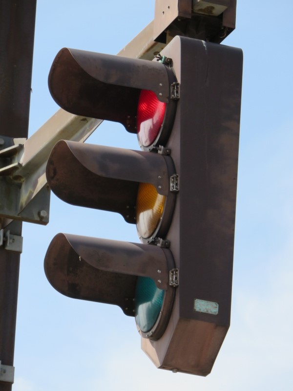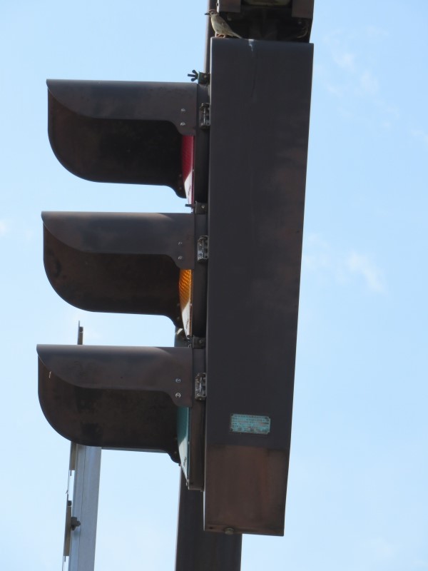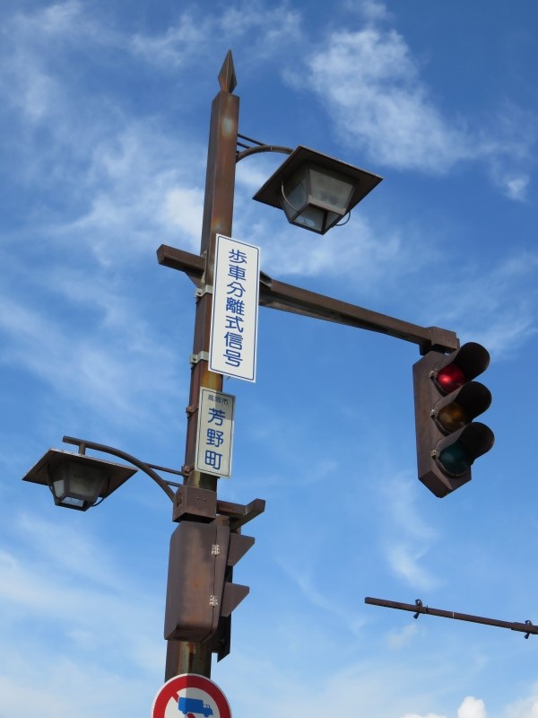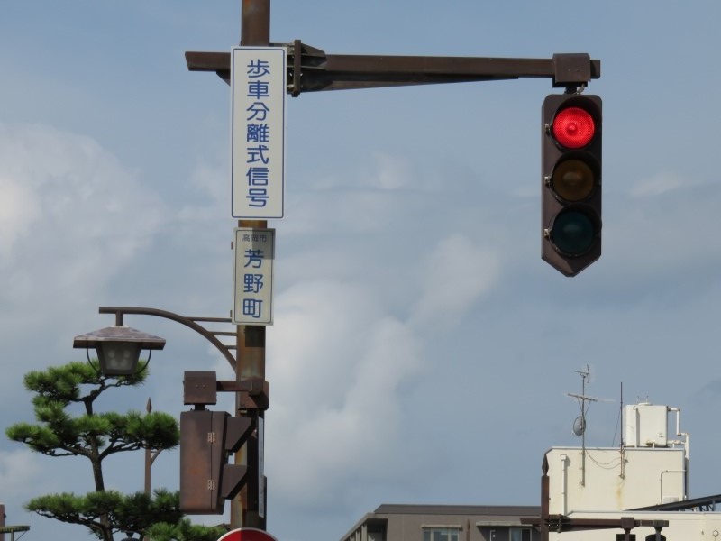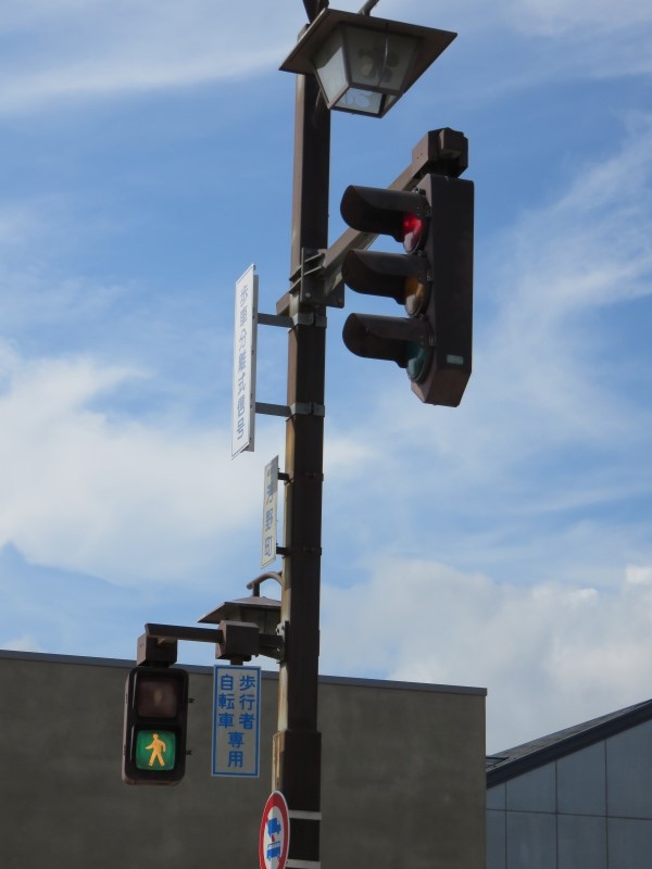 ところが高岡市の高岡駅近くの交差点に五角形のオリジナルデザイン車灯が2基だけ設置されていました。(同じ交差点の歩灯は、富山市・高岡市などでよく見る箱型のものでした)